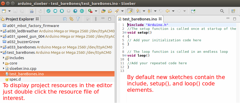 | Display test_bareBones.ino | Image depicts the actions necessary to view the contents of a project resource file. |