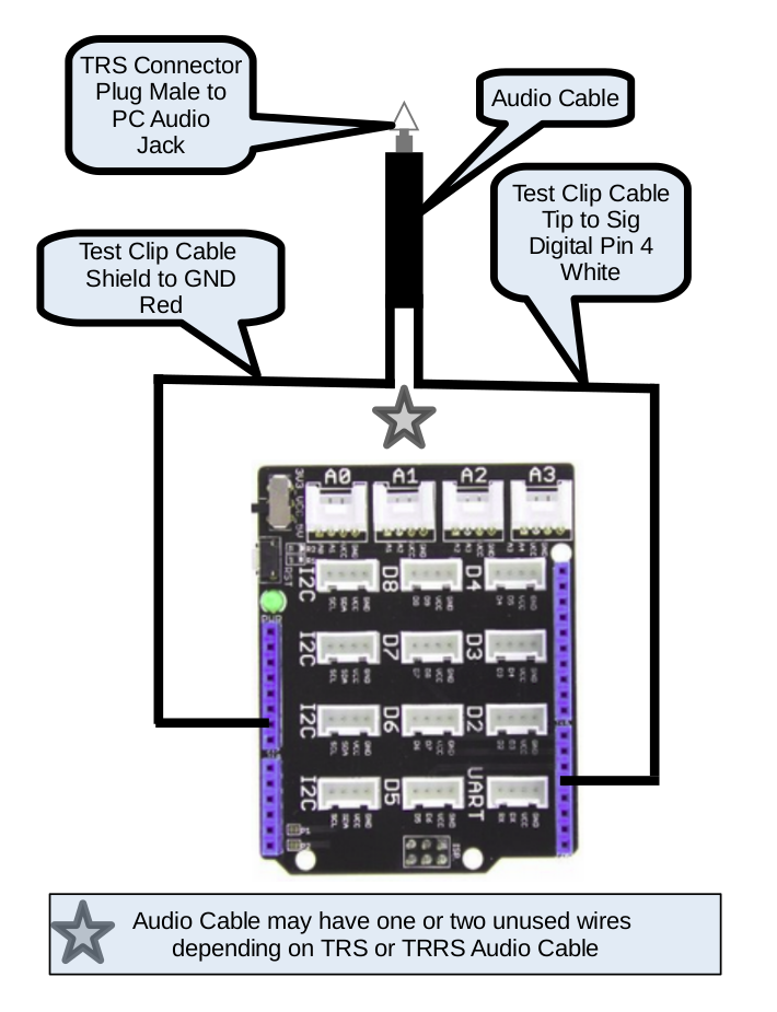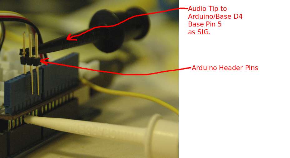 The PC Audio cable Tip wire is connected to D4 (Pin 5) of the Base Shield. The connection could also be the made with a Pin 5 of the Arduino with causing an issue.