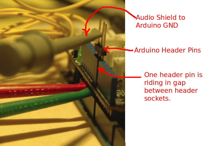 The PC Audio cable Shield wire is connected to one of the GND pins of the Base Shield Arduino. The connection could also be the made with a GND pin of the Arduino with causing an issue.