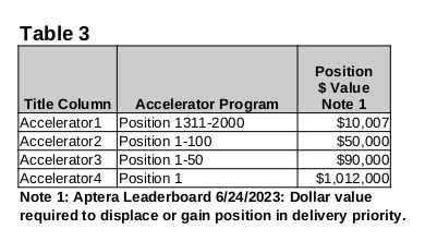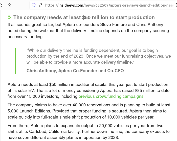 Publicly Announced Aptera Finanical Information Aptera's Crowd Funding Accelerator Program Offering Circular: SEC filing Public $50M Funding Plan for Manufacturing (Source) Public Funding Grant of $21M to Meet $20M - $50M Need At a public "Apter Ambassadors" meeting it was announced (06/22/2023) that Aptera was highly confident in receipt of loans from DOE under the ATVM1 program. With that information in hand Aptera expressed that production should begin during the Summer 2024. (Note 1: ATVM: Advanced Technology Vehicles Manufacturing Loan Program under authorized by the Energy Independence and Security Act of 2007.) Goal: Accelerator Program $20M to $50M allows Aptera to accelerate its production plan, Announced: Aptera received notification of CA Grant of $21M to be used as a reimbursement program. Leaderboard Posted by Aptera As of Noon 6/24/2023 Status: $18.7M toward $20M goal Worstcase: $18.7M (Accelerator Program) + 18.7 (of CA Grant of $21M) = $37.4M Shortfall: $50M - $37.4M = $12.6M Best Case: $21M (Accelerator Program) + $21M (CA Grant) = $42M Shortfall: $50M - $42M = $8M Burp Remaining: $8M to $12.6M Estimated $ to unseat current Leaderboard position holder to improve delivery priority of "a" vehicle Position 1 Requires: $1,012,000 Position 1st-50 Requires $90,000 Position 1st-100 Requires $50,000 Position 1311-2000 Requires $10,007 (Note: Acceleration Program Launch Version: $33,200 - 5% Discount on purchase of one vehicle) |