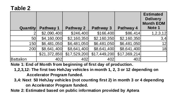 The financing landscape for the Hog Jackson Weapons Platform is rapidly changing. The manufacturer, Aptera, has secured sufficient capital investment