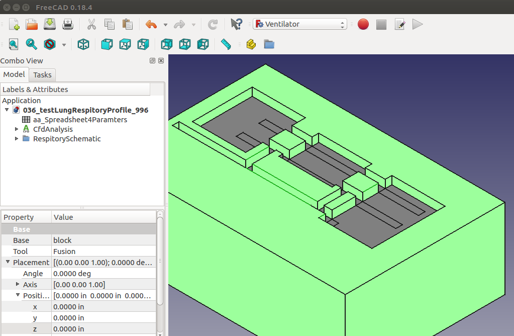 Initial creation of the 3D model of the respitory schematic as rendered in FreeCAD 0.18.4