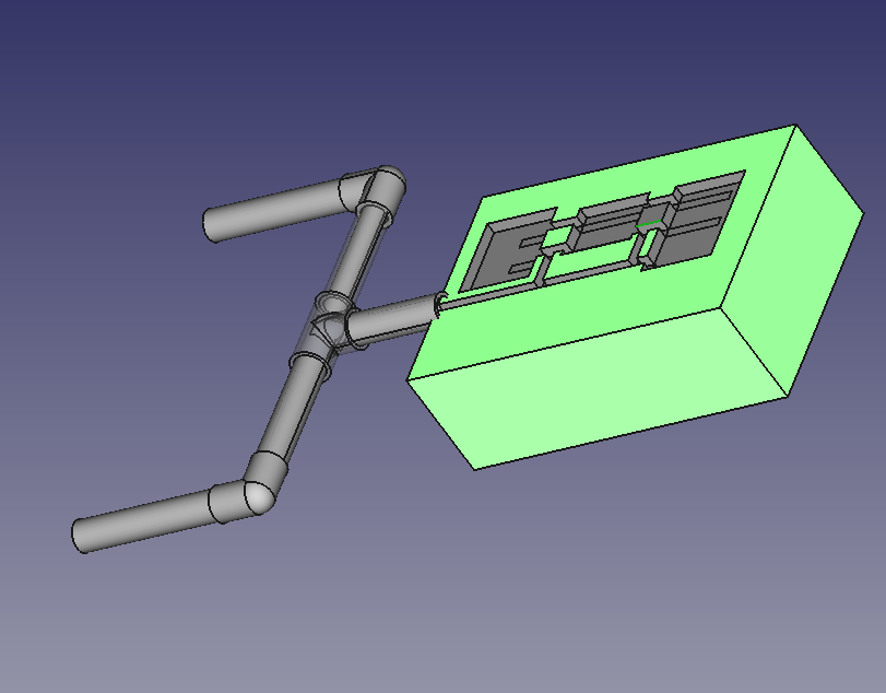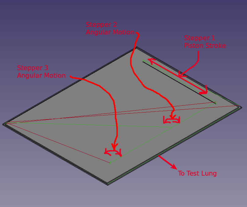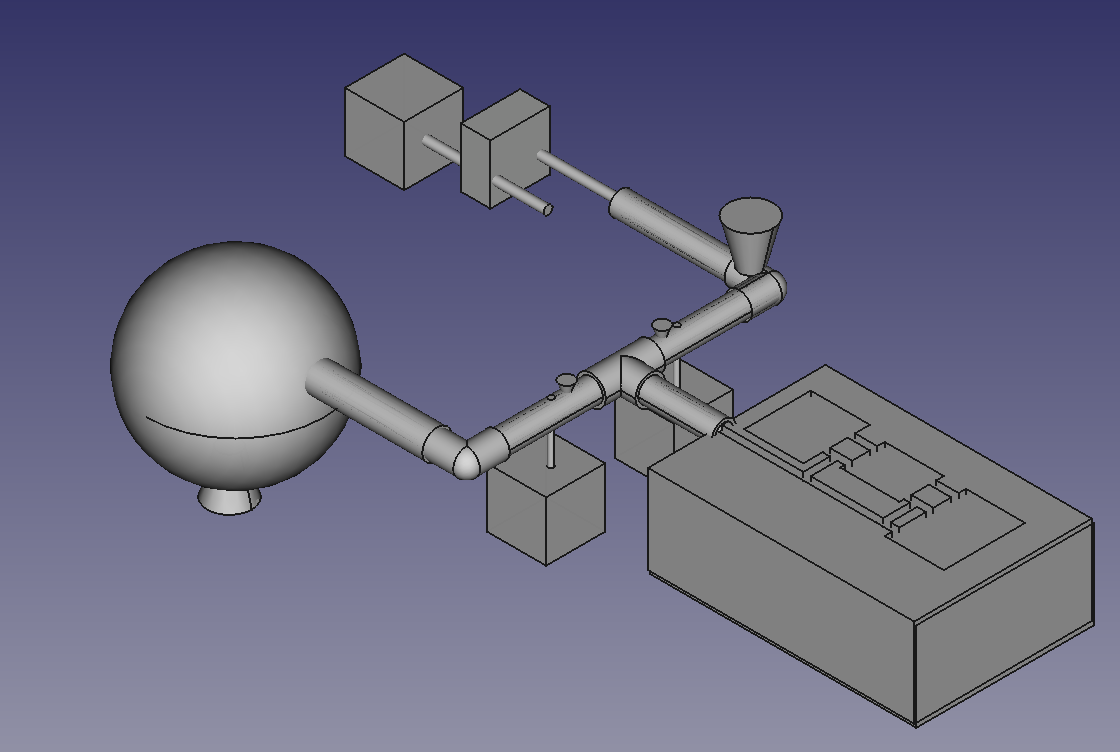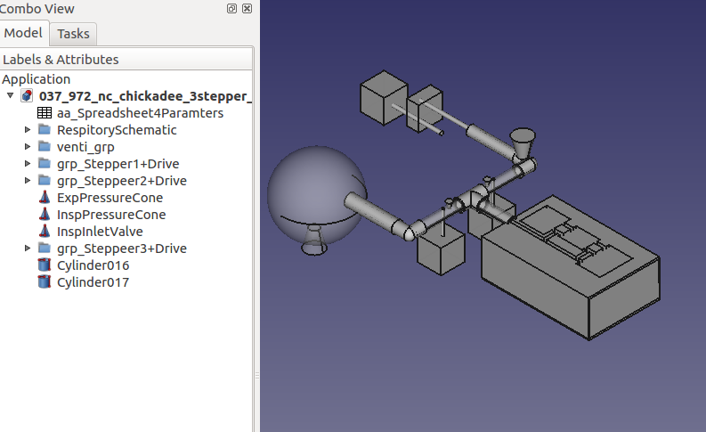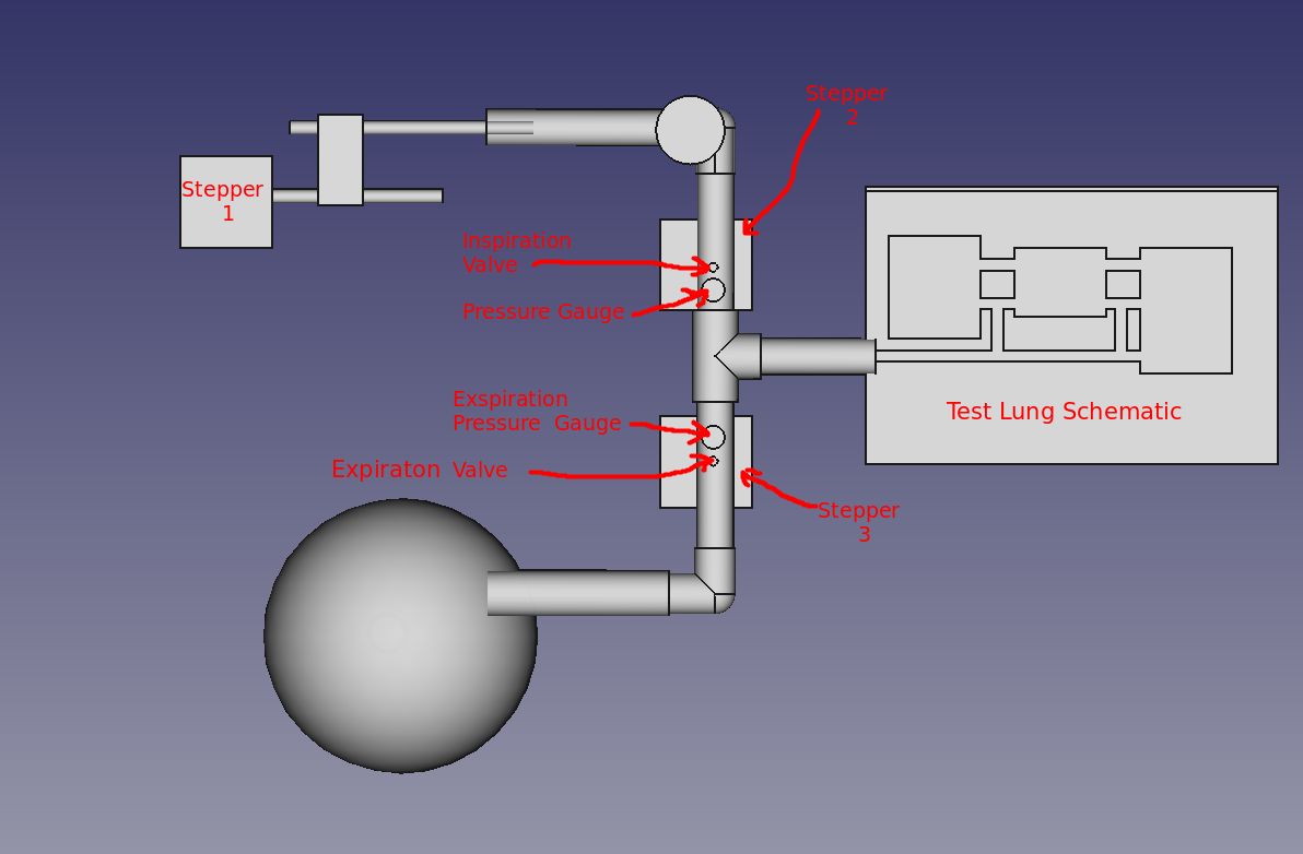 FreeCAD was used to generate the "test lung schematic" in 3D. It was also used to render a 3D depiciton of the mechancical asssembly of the envisioned stepper motors, drive mechanism, valves, pressure gauges, inlet and purge ports, etc. It also served as the tool for visualizing the conversion of milling operations into a piston stroke amd opening/closing valves. |