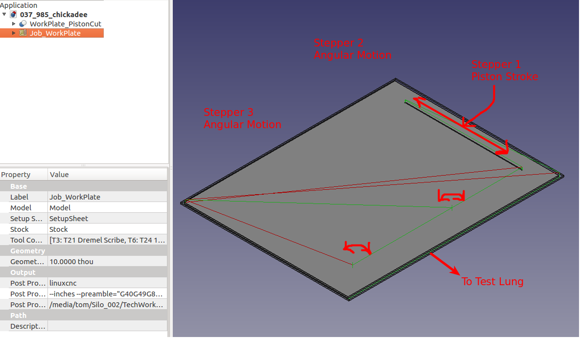 With the basic plumbing established for the ventilator simulator, the next phase in the mechanical design was to describe a set of CNC milling operations that would drive a linear piston for a specificed distance and open/close airflow control valves with precision. This set of milling operations would then be submitted to FreeCaad's Path module for processing into collection gcode statements. This collection forms the "toolpaths" that the CNC milling machine will follow. |
