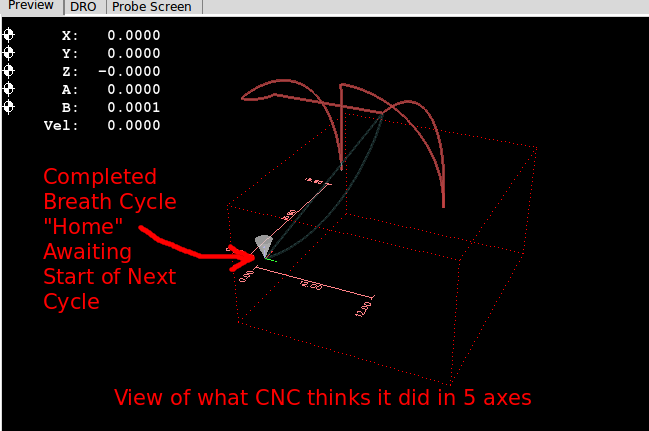 But the Mechanical Ventilator Design allows the "project" to make a very important simplifying assumption. The design of this ventilator simulator is only concenred with a piston stroke and two small rotating disk that all lie in the same work plate. This greatly reduces the complexity of the gcode required to make a back and forward stroke and two separate angular moves. Further reduction in complexity can be made by forcing the CNC "home" location to the starting point for the "pull" piston stroke. Next the angular movement controled by Stepper 2 and Stepper 3 (inspiration and expiration values) can be assumed to occur at both the start/end points for the pull and the push stroke. In essence the project forces the ventilator simulator to make all motion in one work plane while the CNC "thinks" it is moving in three separate axes XAB with YZ held at (0,0). |