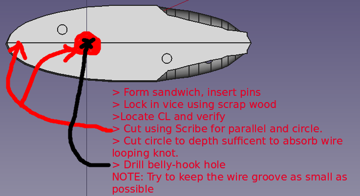 {SideB} Drill Belly Hook Hole to suit wire (1/16). Run drill deep into SideB but do not penetrate to SideA.