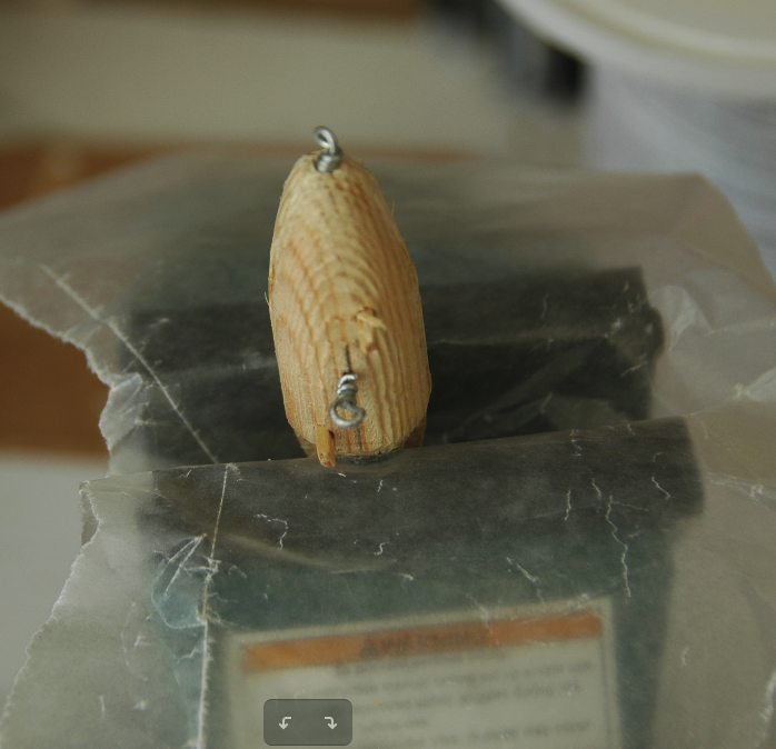 Using both sides, the dowel pins, and subassembly through wire temporarily assemble the lure with the through wires.