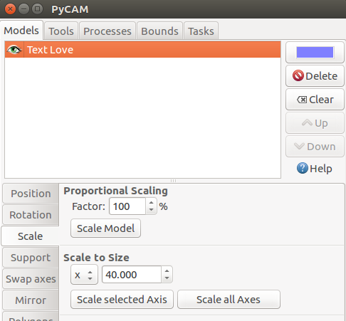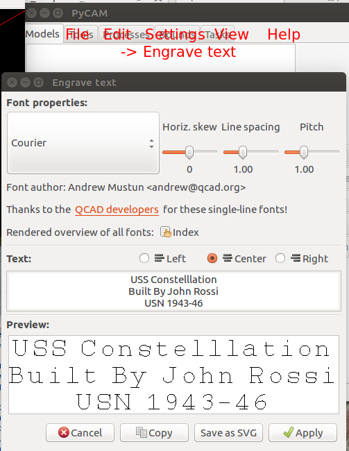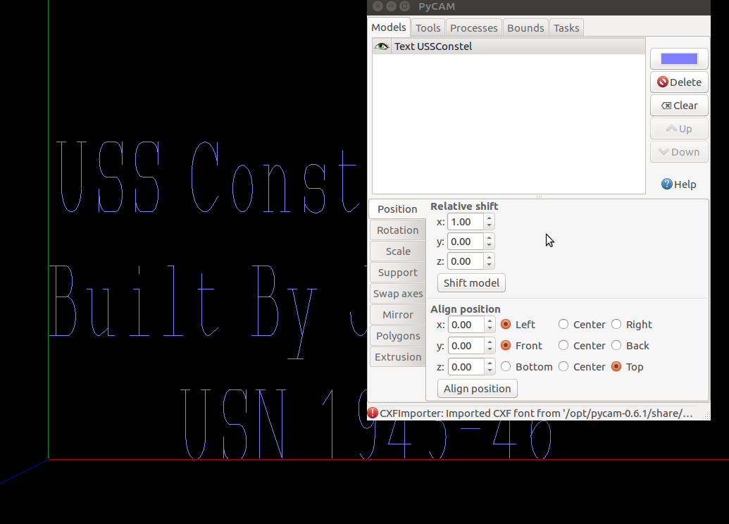 Engrave Text Component: Prior engrave experince with pyCAM led to using that tool for the engrave text. A pyCAM session was started. The default model deleted