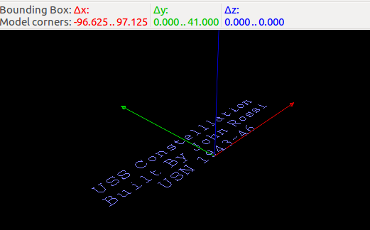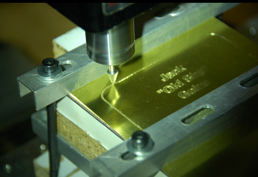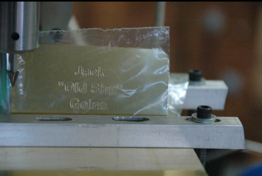 From 2018: (OpenSCAD/PyCAM/HeeksCNC/LinuxCNC) A brass nameplate for use on the display of a model of the USS Constellation was milled. It was a