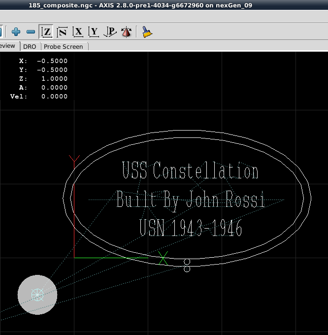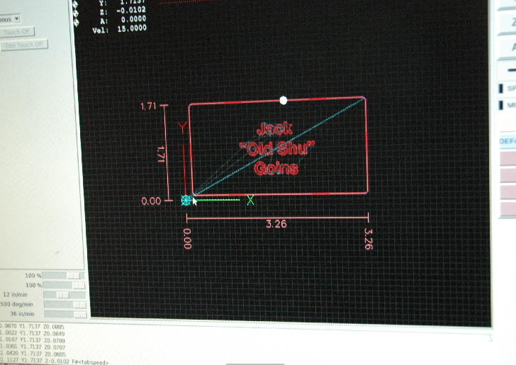 Based upon the simulation run a decision was made to "modify" the original FreeCAD gcode. The modification employed various used defined variable for x-, y-, and z-axis speeds, a "safe height to which the bit was raised in the z-axis for relocation. The modification also consolidated the actual engrave loop for milling the three lines of text. |