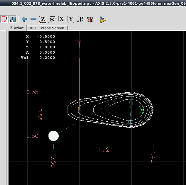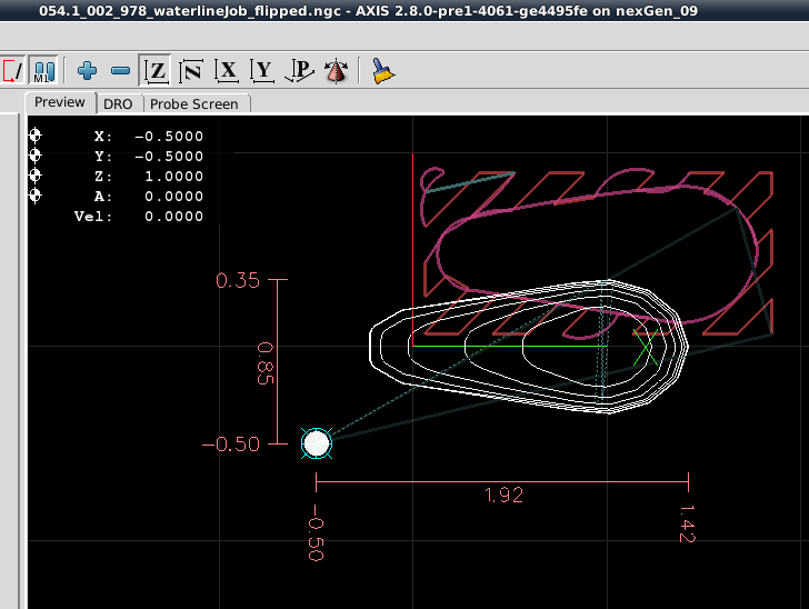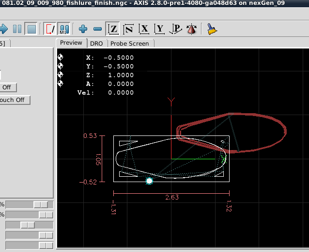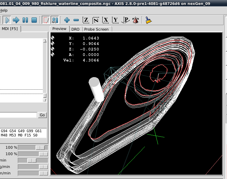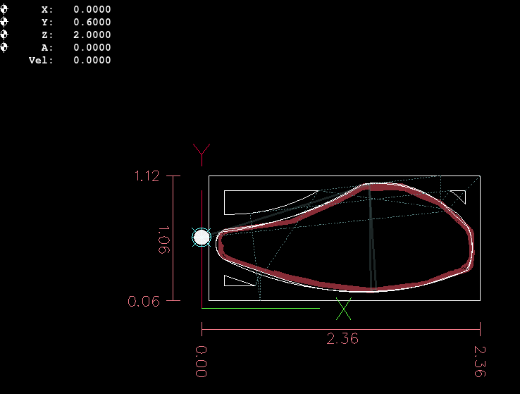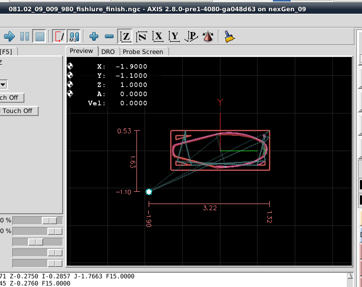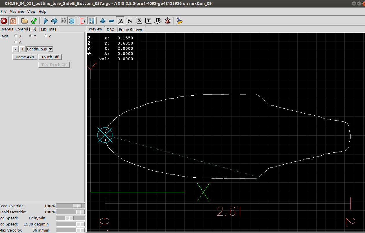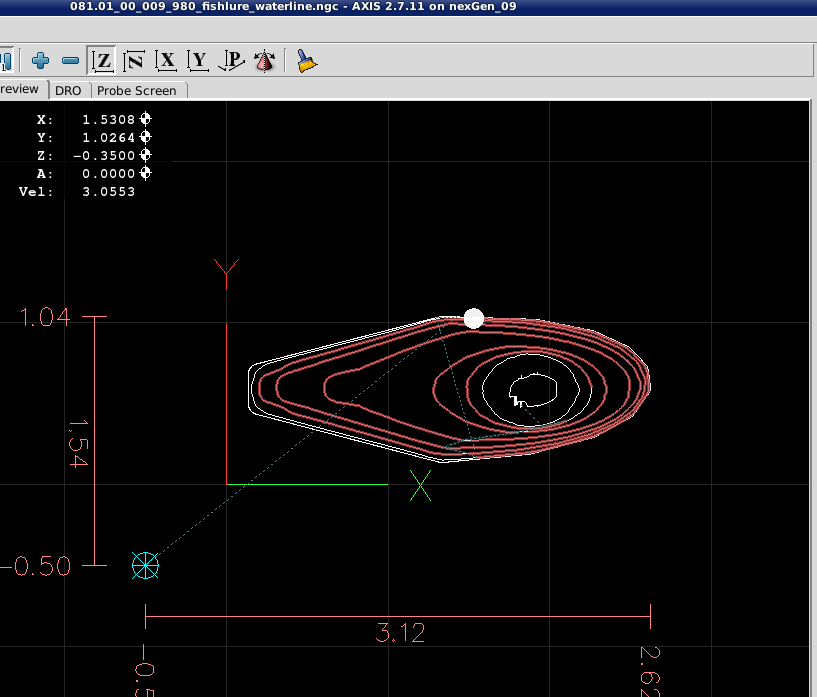 From that point forward the Dorsal Half and Belly Half were available for creation of Jobs and the associated *.ngc code. The Through Wire Processing was originally attempted as a separate CAD/CAM CNC gcode process. But common sense that it was better to create the Through Wire grooves, drill Belly Holes, Alignment Holes, "custom fit" craving of gaps for wire wraps manually, and adding a pocket cut to provide mating surfaces with the plastic lip. NOTE: For this early prototyping of the 021.4 style lure, the pocket cut was executed post-bandsaw separation because the need for the lip had not been confirmed. The difficulty in the alignment curved body lures presented with this deferred pocket cutting of the prototype strongly suggested that this pocket needs to be cut prior to the waterline surfacing while the centerline and factory edges of the woodstock can be employed.