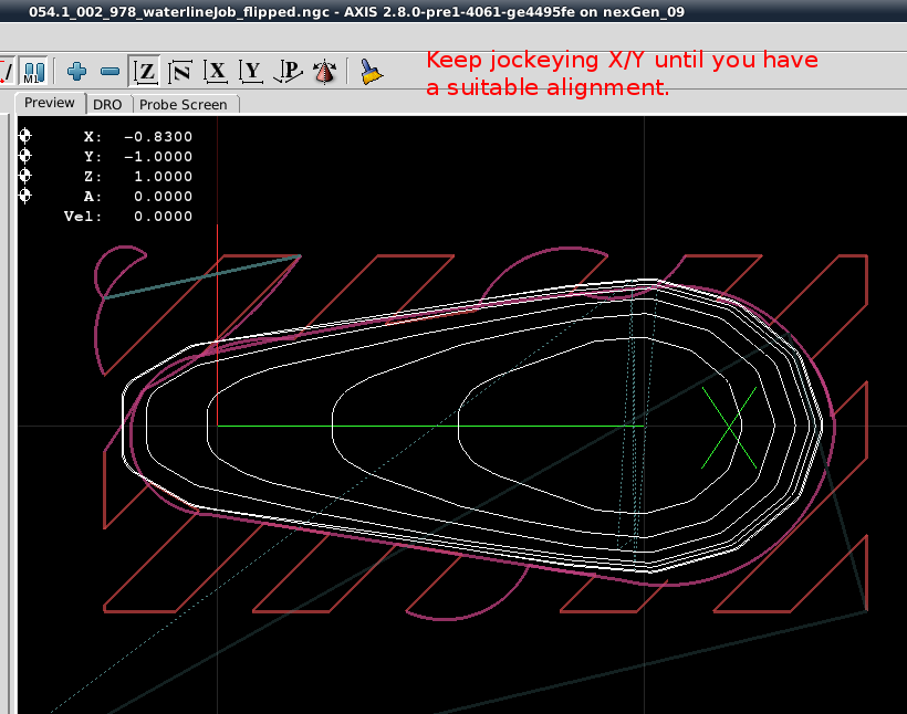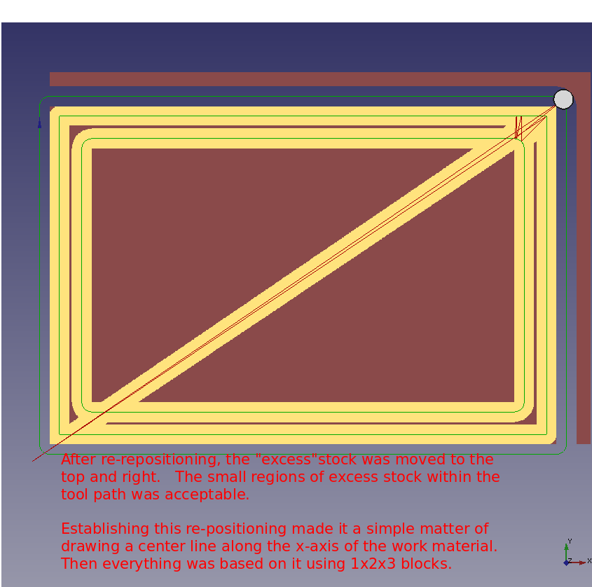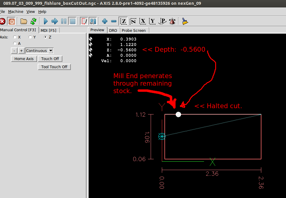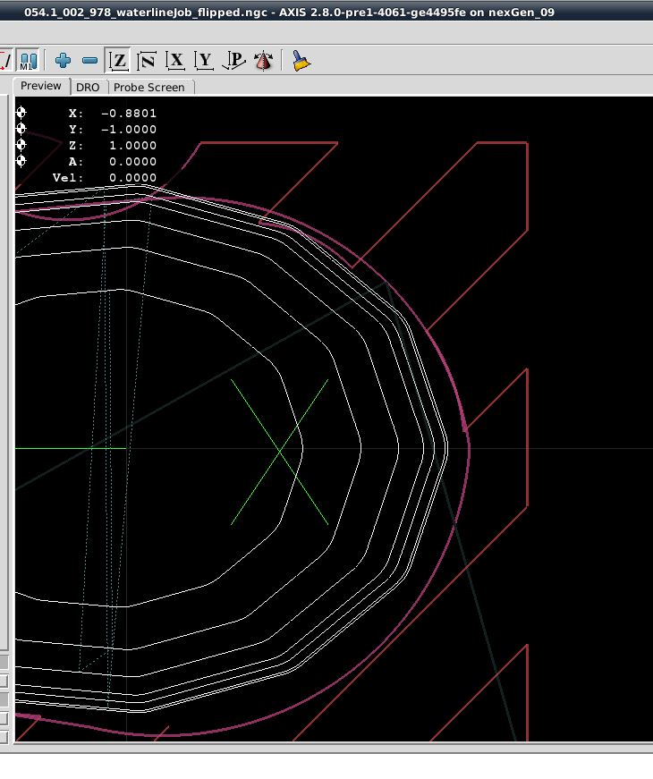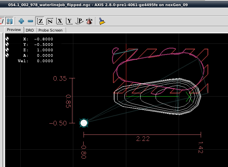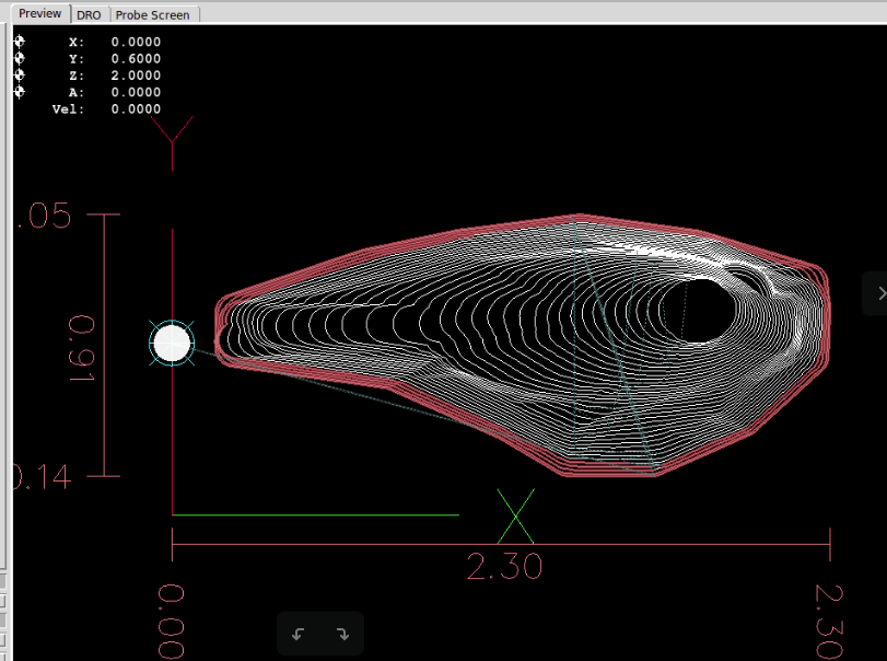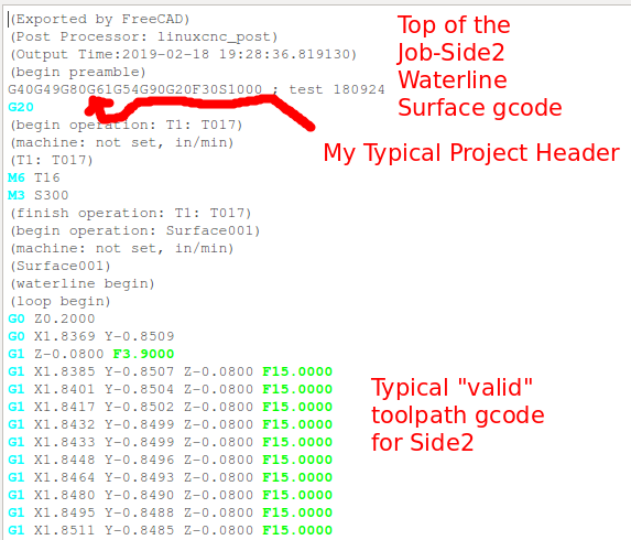 From that point forward the Dorsal Half and Belly Half were available for creation of Jobs and the associated *.ngc code. The Through Wire Processing was originally attempted as a separate CAD/CAM CNC gcode process. But common sense that it was better to create the Through Wire grooves, drill Belly Holes, Alignment Holes, "custom fit" craving of gaps for wire wraps manually, and adding a pocket cut to provide mating surfaces with the plastic lip. NOTE: For this early prototyping of the 021.4 style lure, the pocket cut was executed post-bandsaw separation because the need for the lip had not been confirmed. The difficulty in the alignment curved body lures presented with this deferred pocket cutting of the prototype strongly suggested that this pocket needs to be cut prior to the waterline surfacing while the centerline and factory edges of the woodstock can be employed.