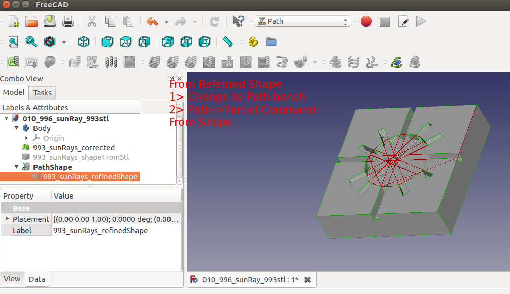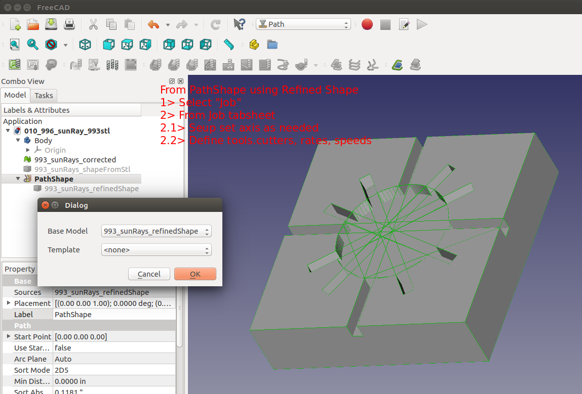 (OpenSCAD/Blender/FreeCAD) The STL/mesh file was grabbed from the earlier HeeksCNC effort. It was imported and converted into