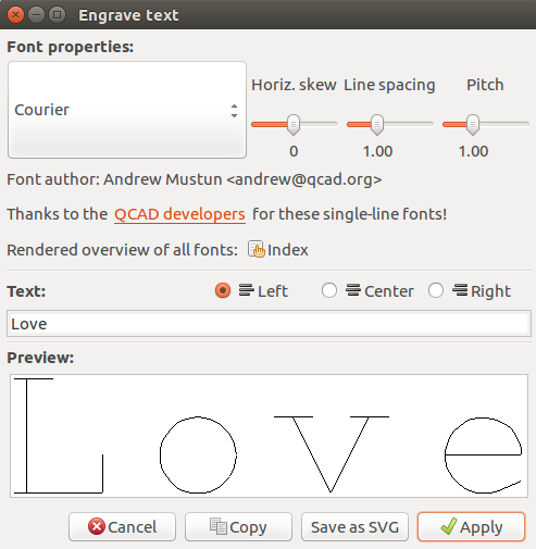 Selecting the "Engrave text" option yielded the Engrave text wizzard. Add "Love" and select