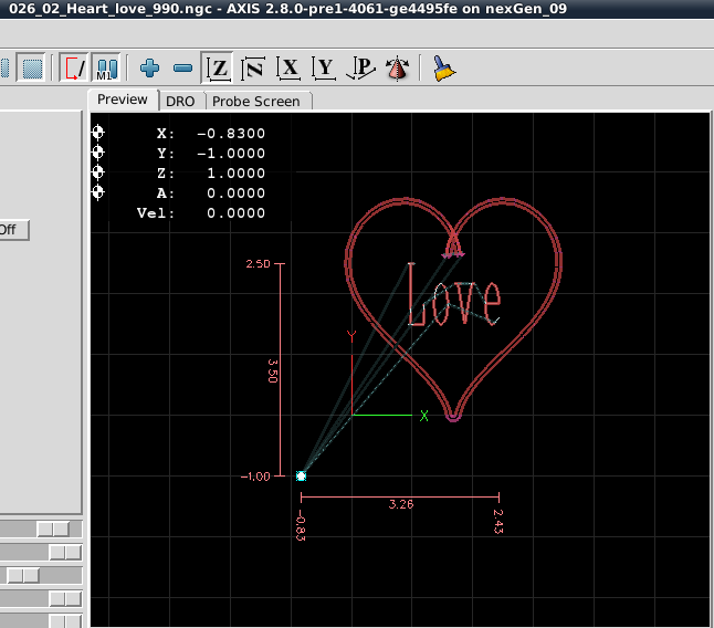 bounds, task, toolpath simulate/export process to yield the appropriate gCode for the "Love" text.