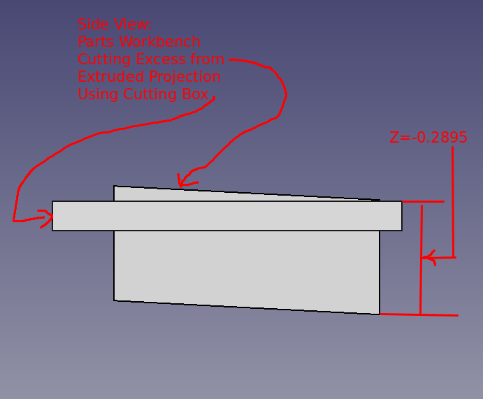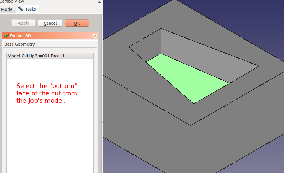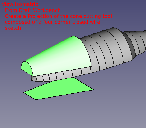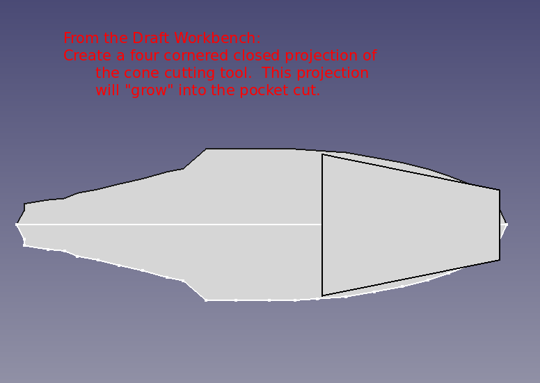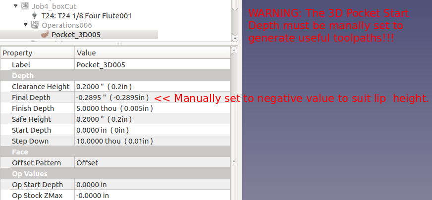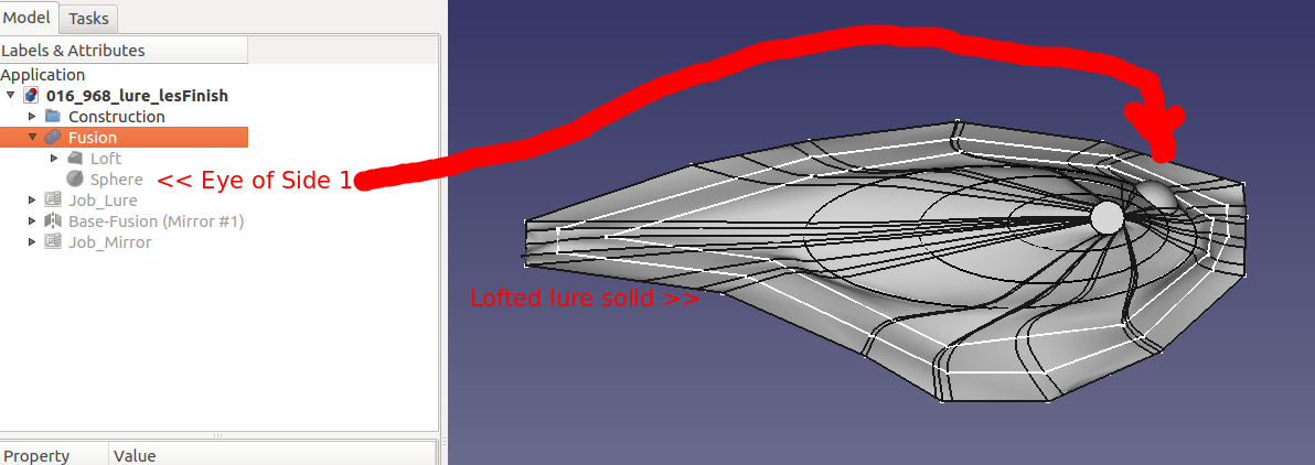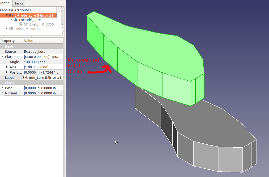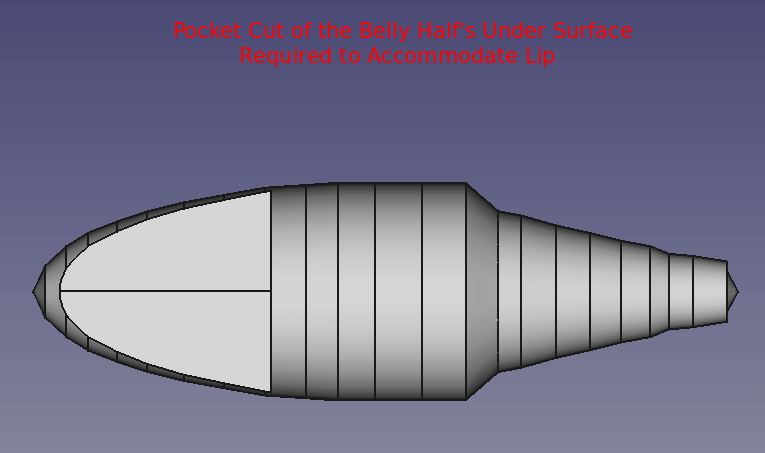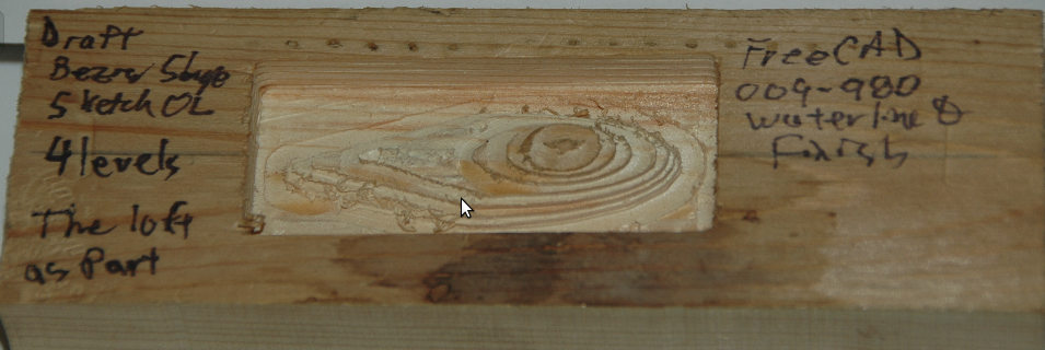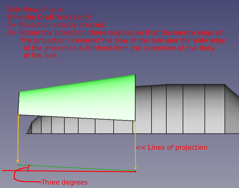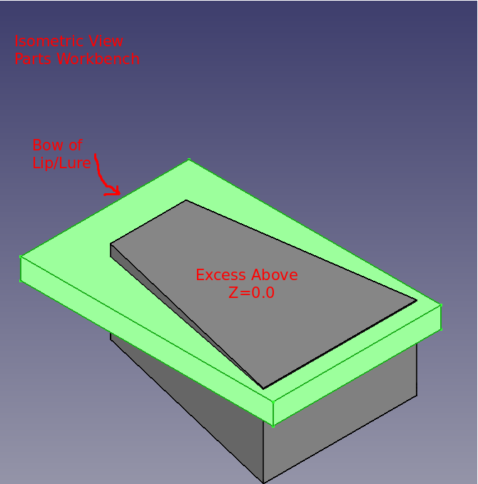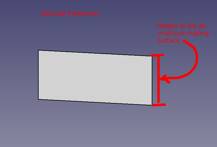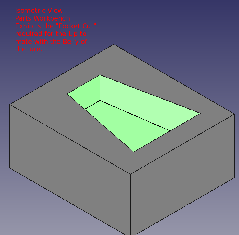 Pond testing, lure confirmed the need for a lip. Various lip designs were attempted using materials such as plexiglass and thin sheet metal. Finally a potential, feasible 3D printer design was discovered. However, that design was determined to be too difficult to insert/mate with the 021.4 style lure body. A modification of that 3D printer design and of the 021.4 style lure was employed. A discussion of the modifications to the lip's 3D design can be found as a "make" of the original lip design. The FreeCAD project 021 was modified to include a pocket cut on the bottom of the lure to support mating with the lip with a modest negative three degree drop. The documents for the 3D printer lip and the pocket cut are provided further below in this section.