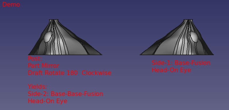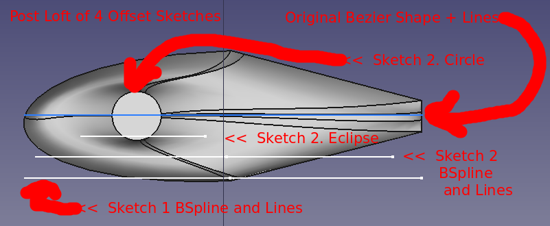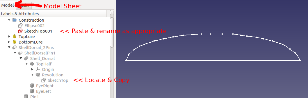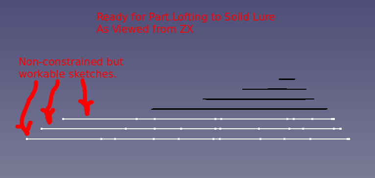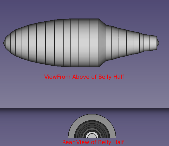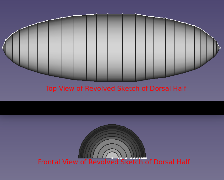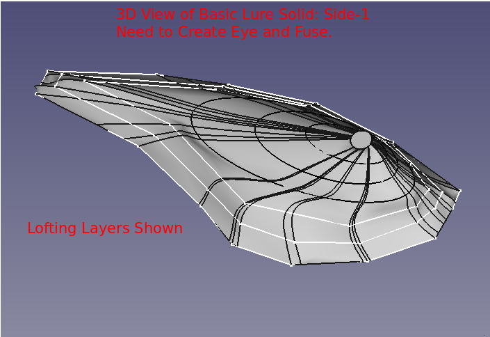 The initial steps in the design differed from the earlier crank lure of Project 016. The Dorsal or Top Side was based upon an ellipse 2D shape. Using this shape as the outline, a continuous multipoint DraftWire 2D line was drafted from the left most point touching the x-axis to its right most point touching the x-axis. Using the Draft bench-revolve, the 3D Dorsal Half was created. With the Dorsal Half defined, it was then copied/pasted as the Belly Half. With the Belly Half shape now available, the Belly Half was modified from within the Draft workbench to generate the "desired" shape.