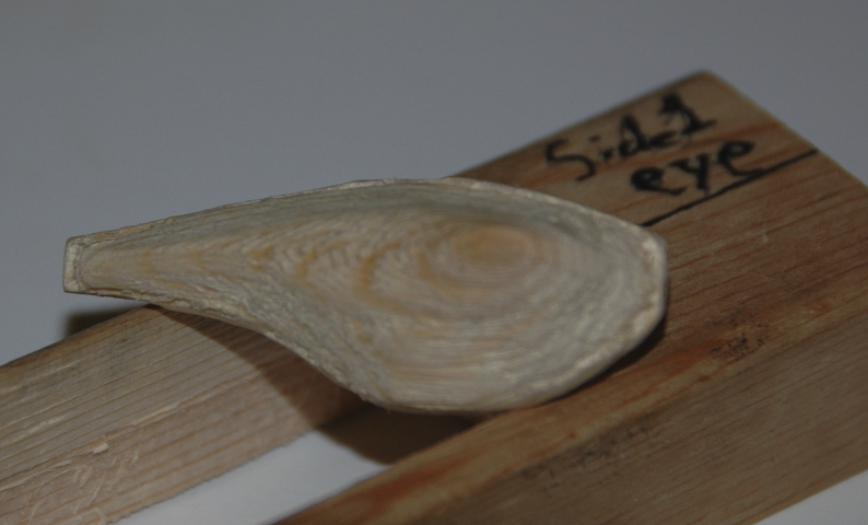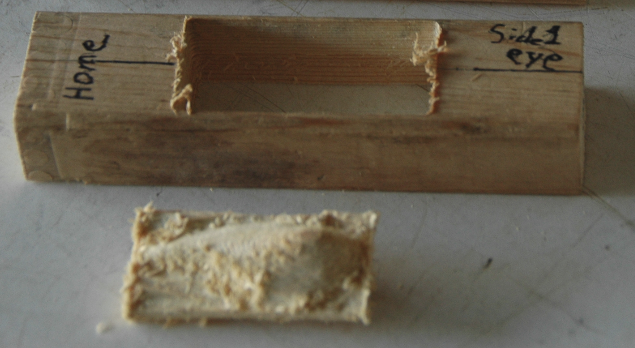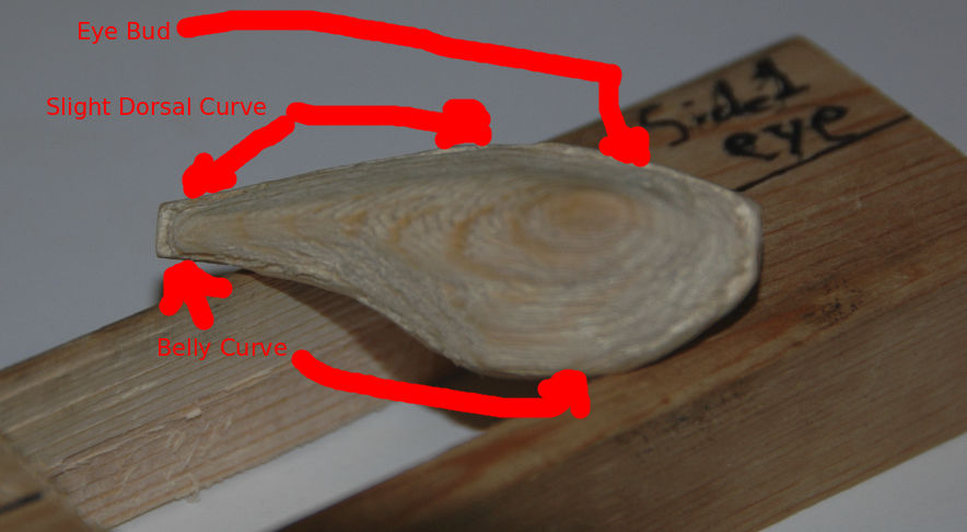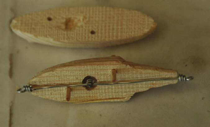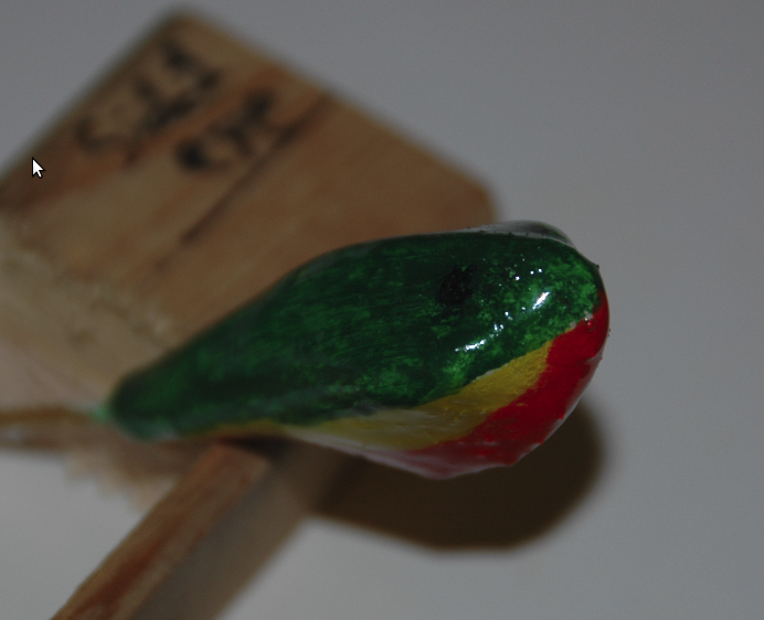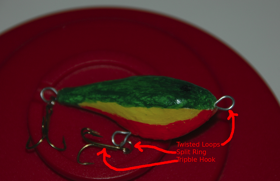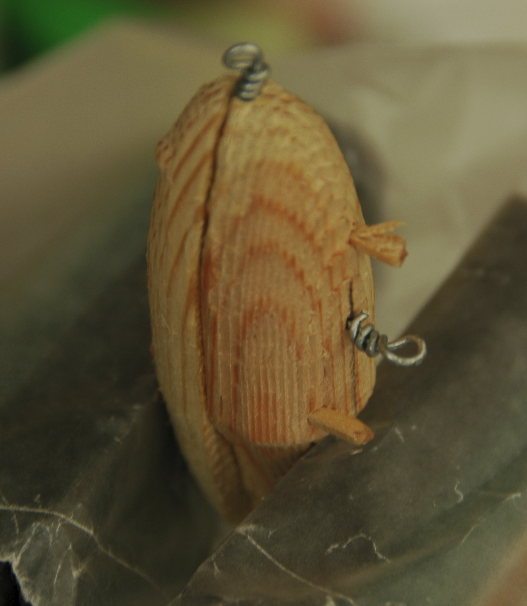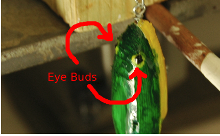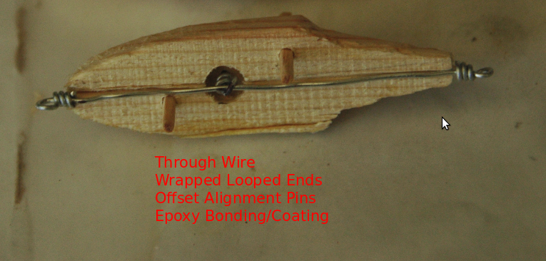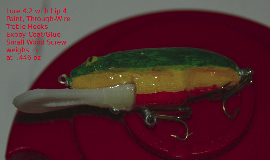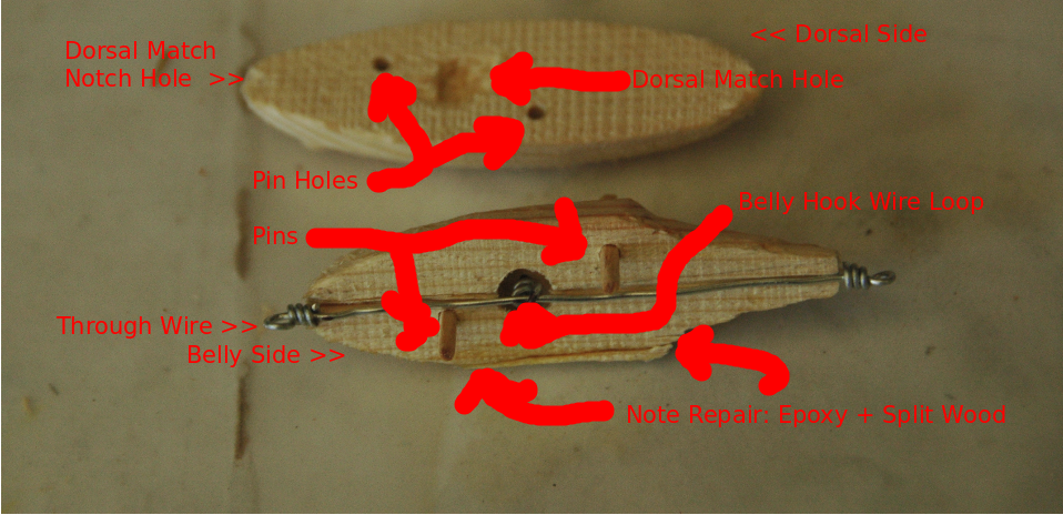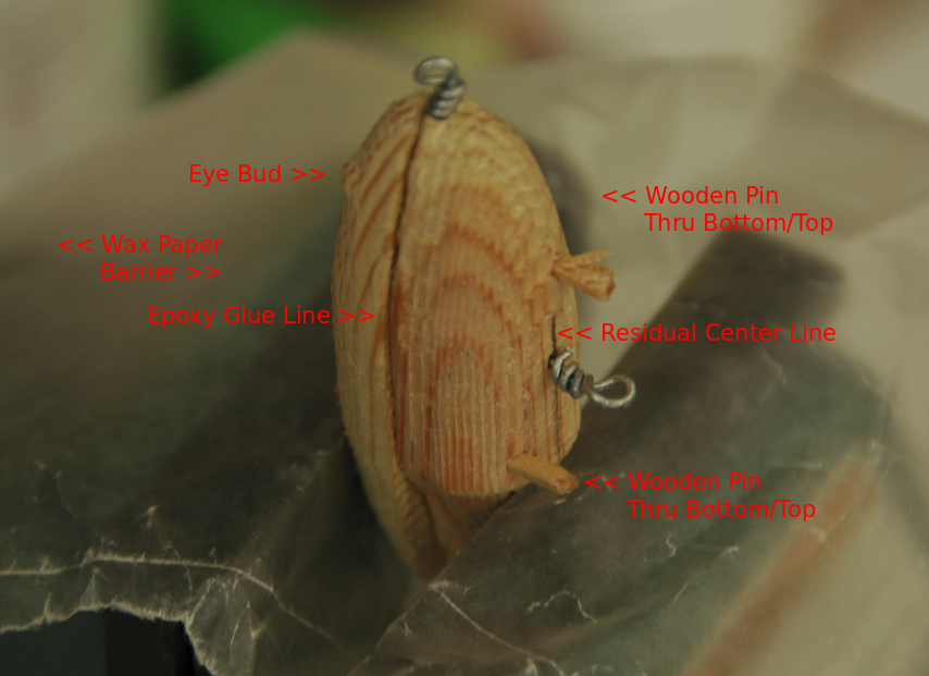Once a "good" fit was achieved with the two halves and alignment pins were epoxied bonded. The excess lengths of the alignment pins were allowed to protrude from the Belly Half while being tangent with the Dorsal Half's surface. Painting coats were added as each dried. Avoid placing paint on the lip mating surface of the lure. Once the lure has dried the lip is ready to be epoxied into place. After that mating joint has cured a slanted slightly off-centerline pre-drill hole should be made such that the lip is pulled toward the mating surfaces of the lure. A small wood screw should then be fully inserted and then sealed. The body of the lure, immediate mating of the lip, and the lip's screw should then be receive sealant coat. The lure hardware was added after a "full" sealant cure in a solar oven.