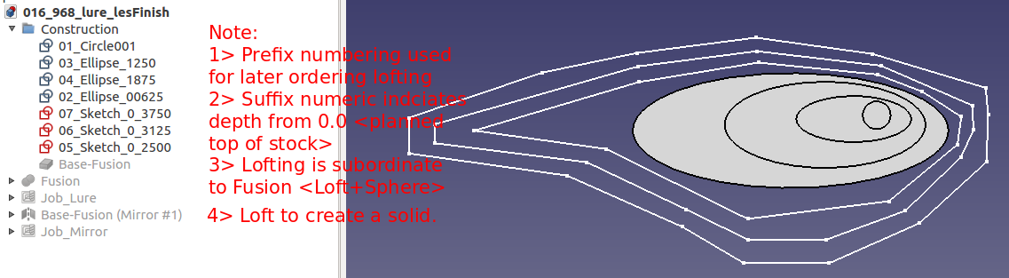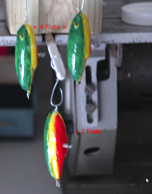 This project, 021_fishlure, employed previously gained FreeCAD knowledge, experimentation with FreeCAD Parts.Revolve workbench.tool, incorporation of four flute endmills, and cable wrapping loops. The results, lure style 021.4, is a stronger, realistically shaped crank style lure. Fish actually took an interest in this prototype.