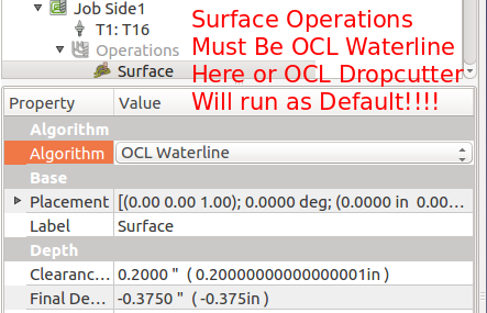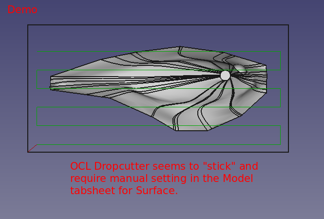 was defined a "Job" was created with an ocl waterline operation and a finishing operation. The finishing operation first used a pocket shape to remove