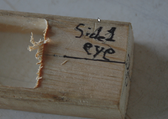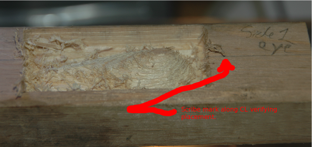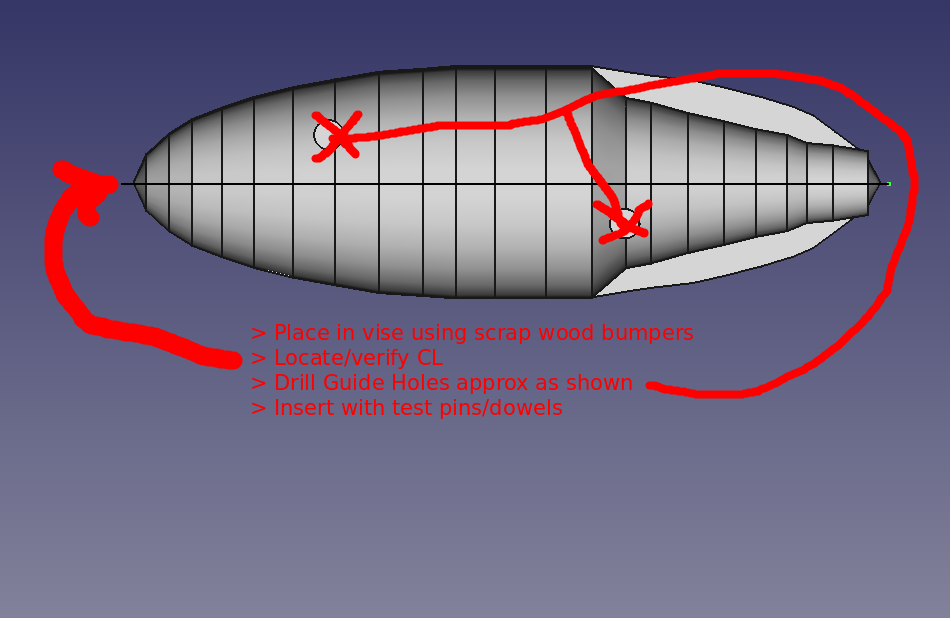 Once the Alignment Pin Holes had been completed the two halfs were separated and then re-assembled. During the re-assembly, the Belly Half was now placed above the Dorsal Half such that the Alignment Pins could be inserted to allow exposure of the Belly Half's split face matching surface. With the Belly Half's matching surface exposed its centerline could be roughly verified between the head and tail points along the x-axis. The lures Through Wire groove was then scribe to a sufficient depth to allow the wire to just reach the top of the surface. The Belly Hook hole and its associated wrap "bore" hole were drilled. The accompanying "howto zip package" will provide a more detail set of steps as well as the pocket cut gcode and additional files to support this new operation.