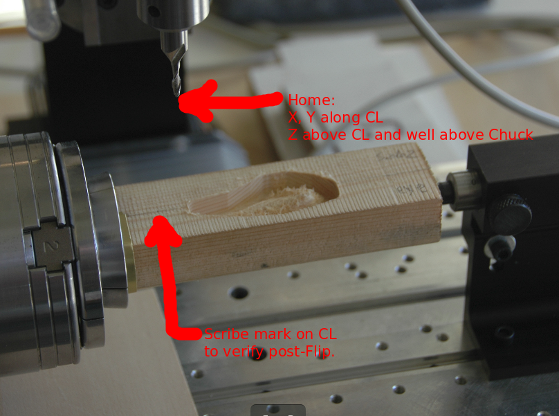 Design to gCode Process Flow With a collection of nine gcode files the project was moved to the mill. The Probe file was replaced with a level and a "scribe" point engraver to verify centerline on top. Then the work stock was flipped and the bottom centerline was verified. Verification of both top and bottom centerlines involved moving in the X axis along the centerline and "touching at several points. The combination of the 4-jaw chuck, right angle, level, centerline, and engraver/probe produced excellent results. Sequence of Milling Steps: