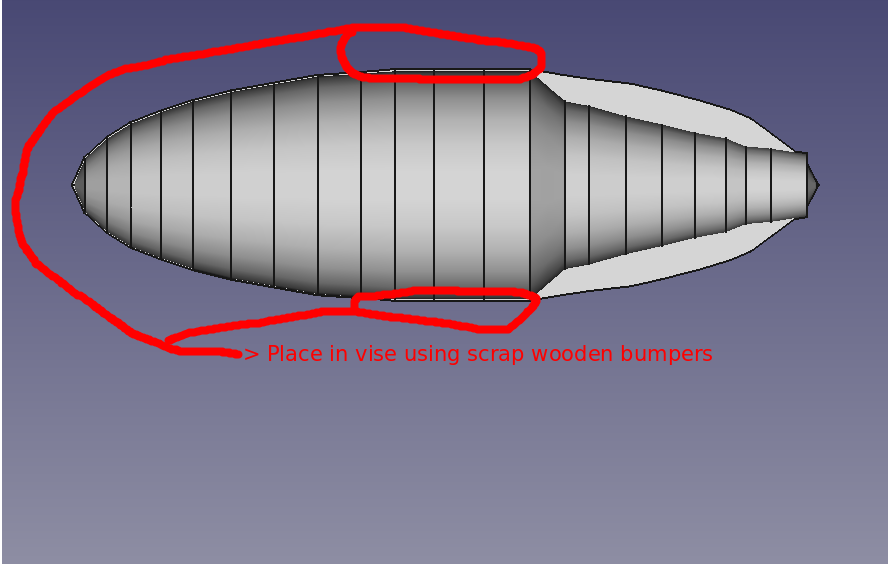 A bandsaw was employed to separate the Dorsal Half and Belly Half from the workstock. The Dorsal Half and the Belly Half were then placed in a vise (with sacrifice wooden bumpers) to allow the drilling of the two alignment holes. The original centerlines (now significantly shortened) of the Dorsal Half were used for the drill operation setup.