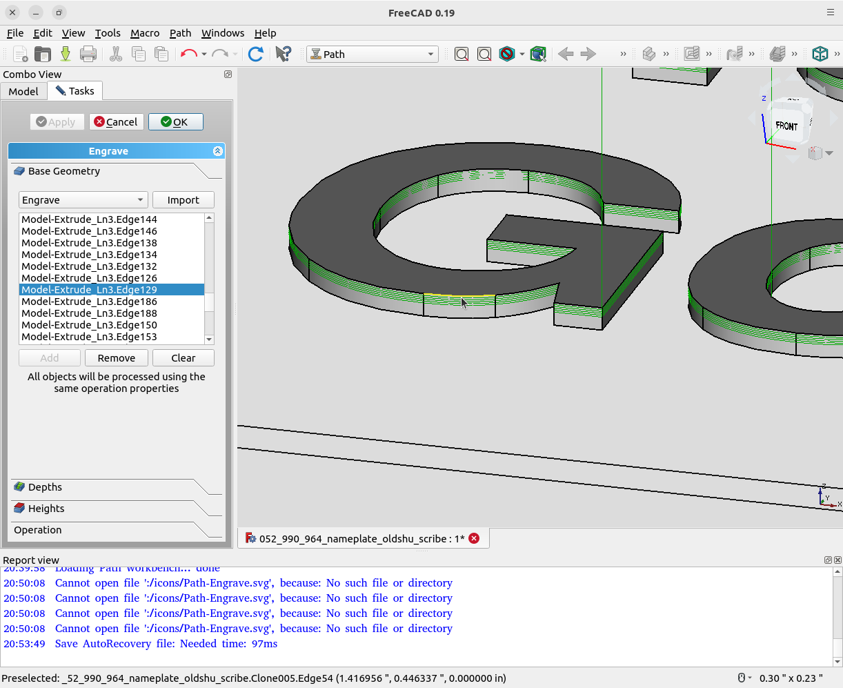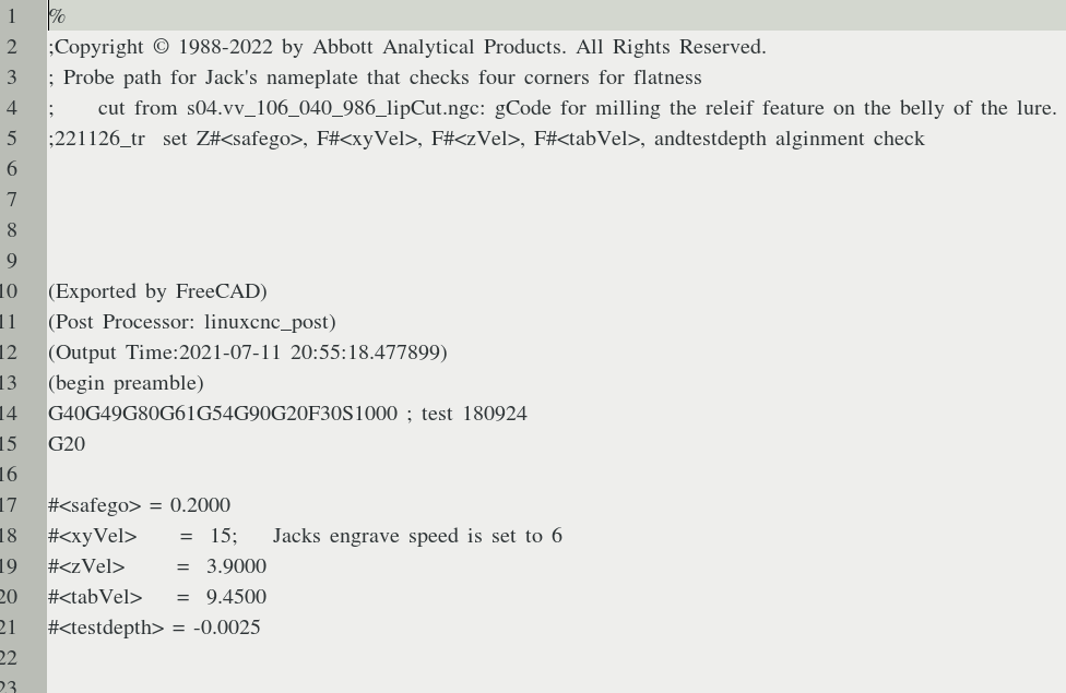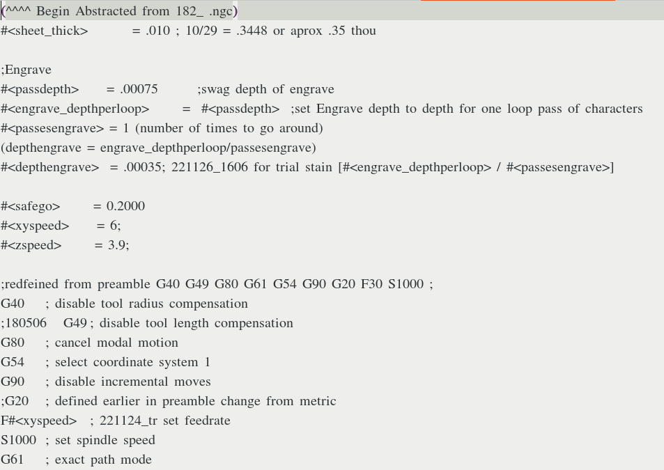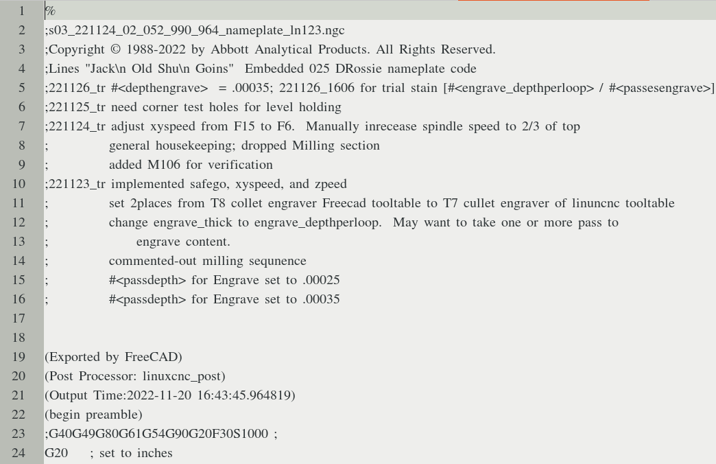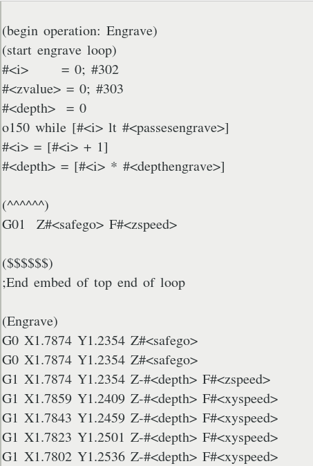 The original FreeCAD engrave process for the three lines of textrequired 6196 separate movements to make five separate levels of depth cuts. In other words the engraving bit would would follow the same path to create the three lines of text five separate times. The only difference would be the increasing depth to which the engraving bit would plunge. Using the LinuxCNC subroutines to control the program flow (the movement of the engraving bit) an engraving loop was created using "one pass" of the original FreeCAD gcode and a logic while less than to check to see which loop to do next or to break-out of the loop. This essentially allowed a "single step through a depth, halt, check". In that manner when the results appeared to be "satisfactory" the milling phases was terminated. |