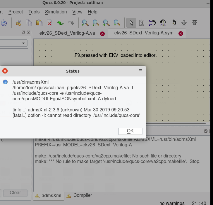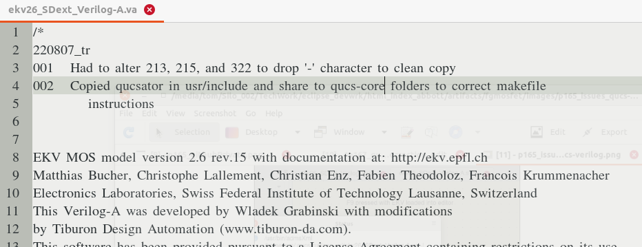 The specific version of QUCS used was v0.0.20. The 'verilog-a-devices' collection of components was added per M. Cullinan's thesis. The only major hickup in installing the QUCS and 'verilog-a-devices' collect was that the verilog build script had three issues that need to be resovled. First the script file ekv26_SDext_Verilog-A.va needed three minor edits. The next complier run produced an error messages which indicated that the qucs-core/file was missing. Subsequent troubleshooting discovered that the required file was located in the qucsator folder. This was resolved by a copy/paste/rename of the qucsator folder to qucs-core. All ran well after these four changes.