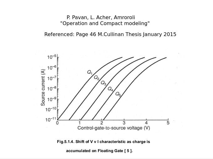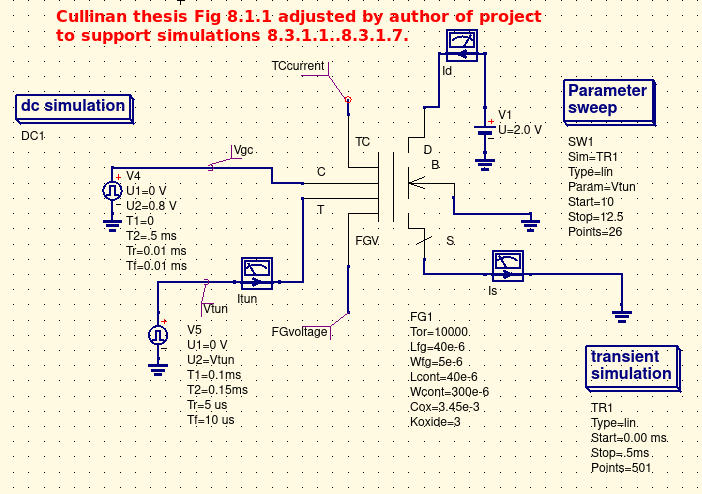 It was at this junction that M. Cullinan's 2015 thesis began to add value to the Floating Gate Electron Reservoir Power Source project. The largest contribution of M. Cullinan's thesis was the mention of the Quite Universal Circuit Simulator, QUCS, mentioned earlier in this project thread. Without the QUCS simulator the FreeCAD work product would merely be an annimation tool demonstrating high level control without quantitifying the charge stored or released. The whole thesis was eye-opening. His introdcution compact Equation Defined Devices was extremely helpful. His derivation of floating gate charge accumulation in Chapter 3 of his thesis was another prime reason for following his steps. M. Cullinan reference (figure 5.1.4) to P. Pavan, L. Acher, Amroroli "Operation and Compact modeling" artifacts provided another key nail in moving this project further.