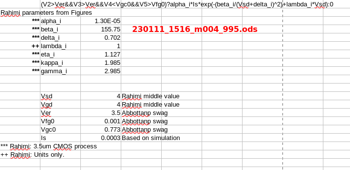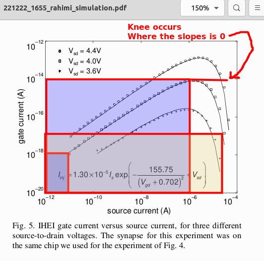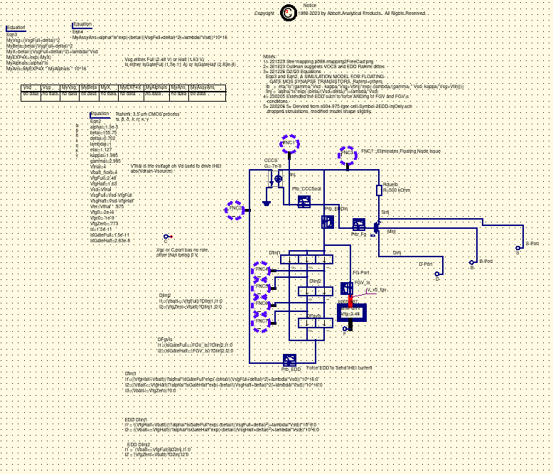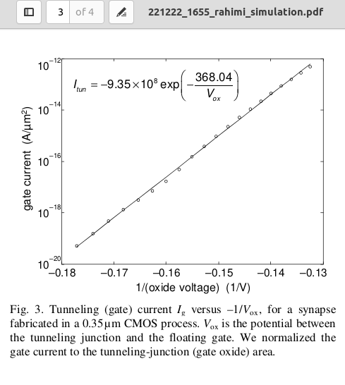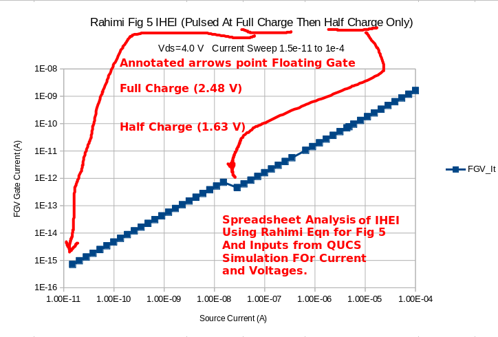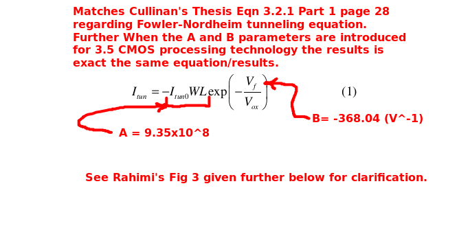 FN: Charging The Fowler-Nordhiem parametrs provided in the Cullinan thesis closely matchs those of the Rahimi abstract. As such the Rahimi parameters shown should be fairly close for this iterration and maturity of design for the Floating Gate Electron Reservoir Power Source. The Rahimi presentation clearly states that the FN tunneling process removes electrons by means from the gate. IHEI: Discharging The IHEI, impact-ionized hot-electron injection, equations and parameters were derived from emperical work by the Rahimi team. The IHEI process as described by the Rahimi's article adds electrons to the floating gate. |
