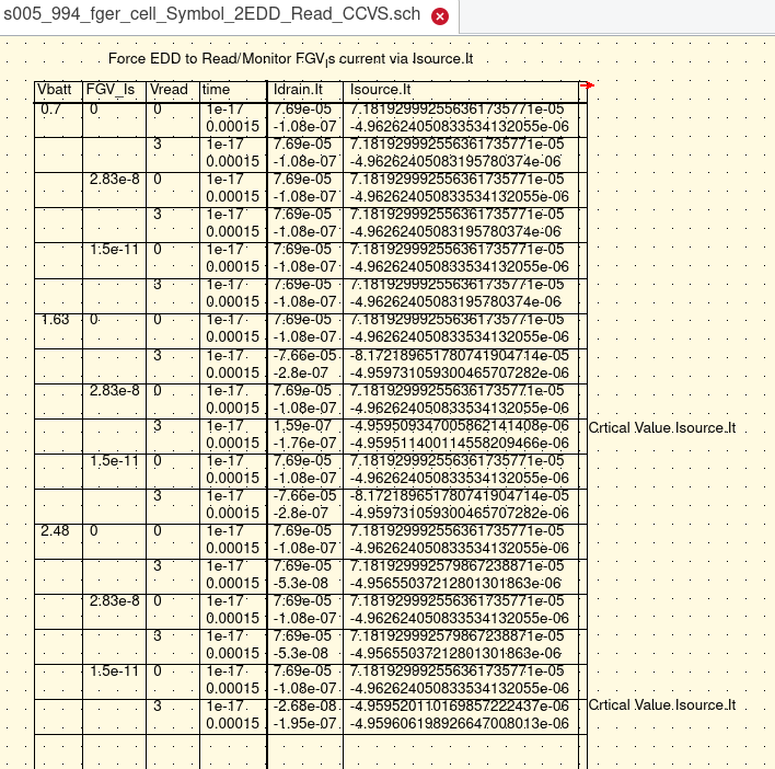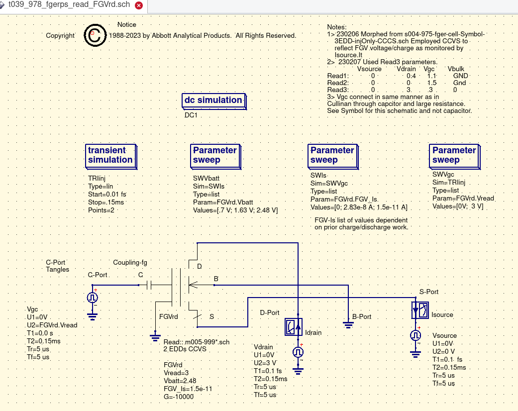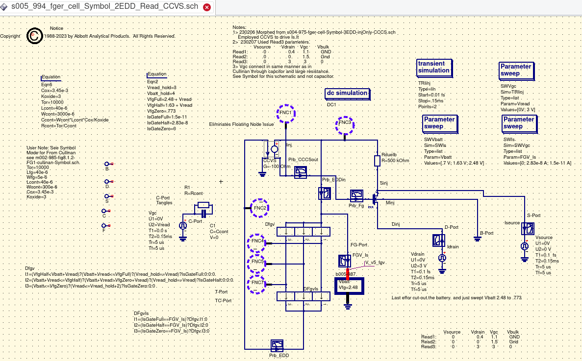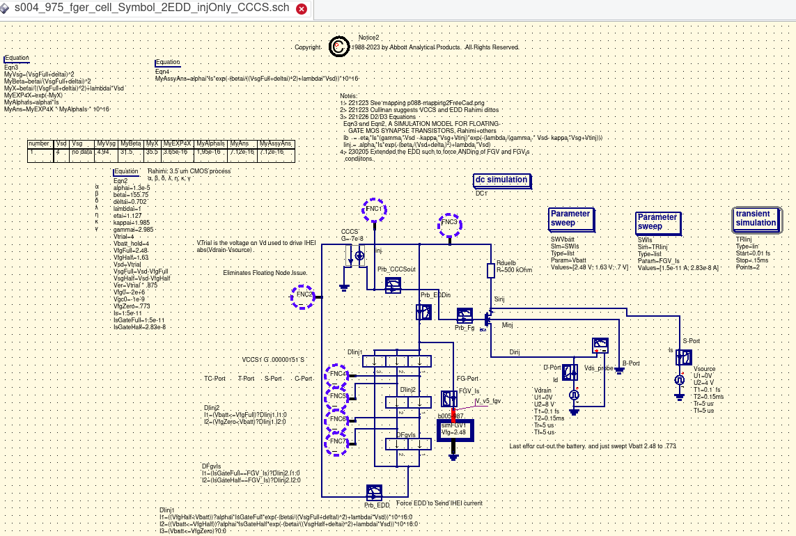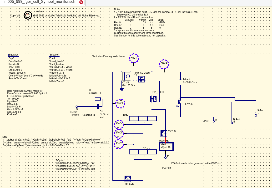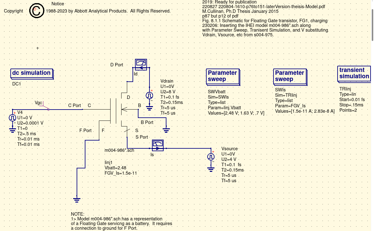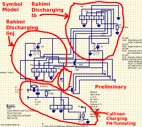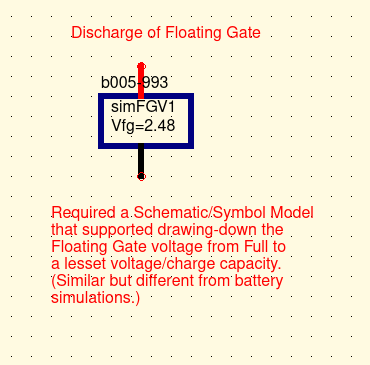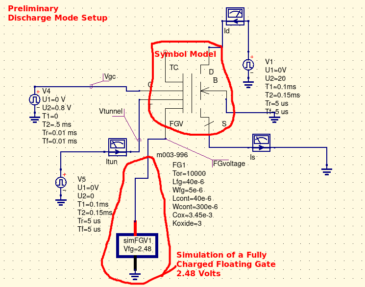 Critical to this effort was the realization that the floating gate once charged was serving as the powersource for the discharge. That demanded a bit of creative thinking and further study. QUCS did not have a 'ready made' power source to assume this role. |