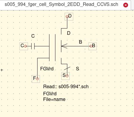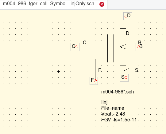 A suitable symbol representing a charged Floating Gate of the Floating Gate Electron Reservoir Power Source device was created. The model was integrated into the Floating Gate Electron Reservoir Power Source device. This allowed the usage of Parameter Sweep QUCS simulations under very fast time transisitons of (drain and source) voltage pulses. For the Parameter Sweep parameters of interest were the Floating Gate Voltage at Full and Half. The other parameter that was needed was the sweeping of the Floating Gate's current in the Full and Half states. These specific conditions were set and and controlled using the "list" input feature of the QUSC Parameter Sweep simulation. |