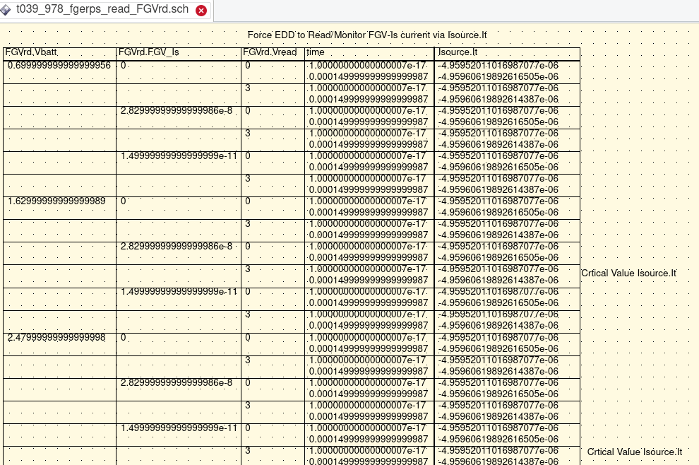 A spike was commisioned to look into how a read/monitor process might be represented in a QUCS schematic. The intention was to put all of the components, transients, parameter sweeps, etc. in one schematic for simulation. The expectation was that the FGERPS team could employ knowledge previously obtained from charge and discharge, employ one or more Equation Defined Devices, insert a Current Control Voltage Supply, and a set of Read critieria to "observe indirectly" Full Charged, Half Charged, and Empty Charge states of the Floating Gate Electron Reservoir Power Source. | ||||||||||||||||||||||||||||||||