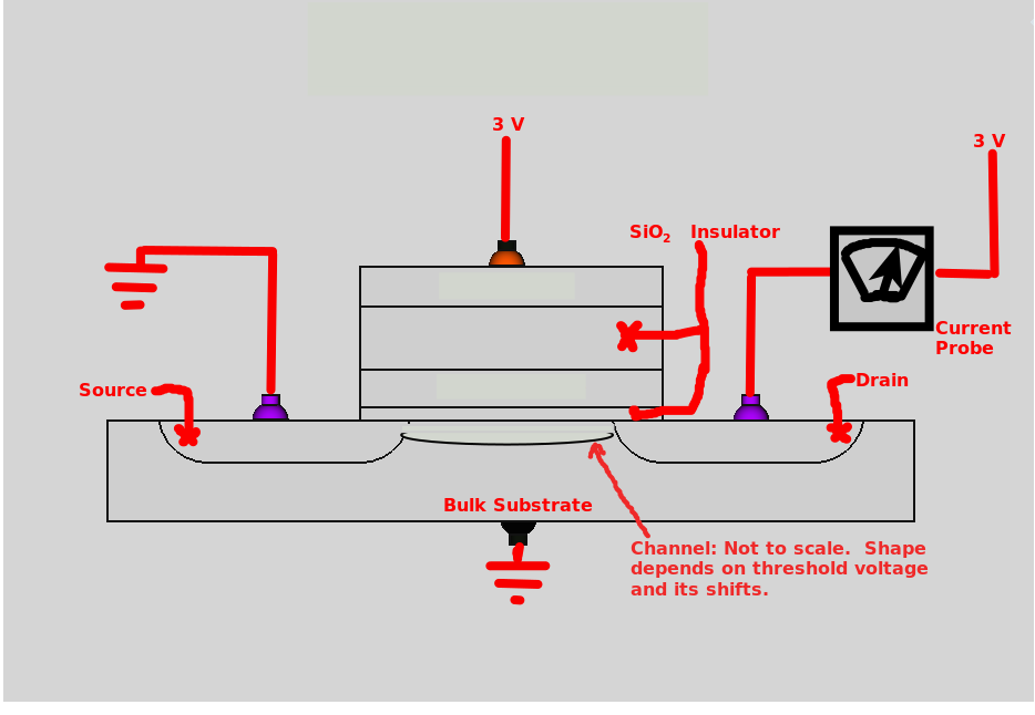 After finally reaching a schematic/model which provided 'ballpark' simulation of the IHEI contribution for discharging/erasing a project simplication decision was made. At this point in the project the contribution of the current cource from the well to the drain is going to be ignored. This decision/assumption will lead to a more conservative simulation estimate. As the project matures this decision may be re-visited. |