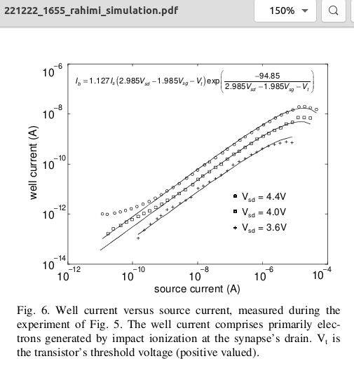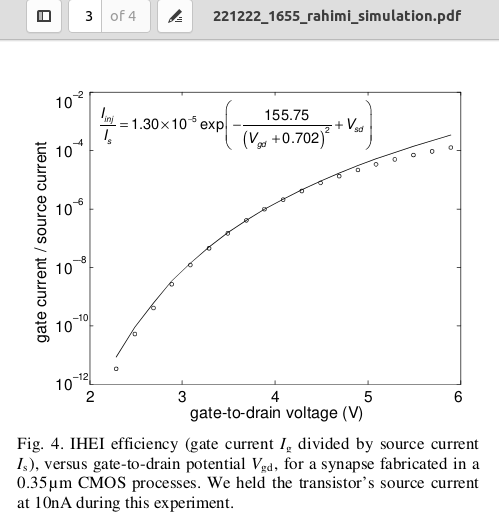 SYNAPSE TRANSISTORS (page 2) published through the University of Washington provides a simulation model for the 3.5 um