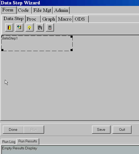 The Data Step Wizard has a work surface upon which the user assembles a program by pulling components from the pallette. Flipping the pallette's page allows the user to select from a number of various sets of program components. As the components are placed in the workspace the
