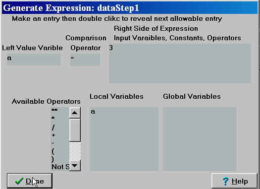 The Data Step Wizard provides graphical user interface for generating an expression. The image aboves shows the simple expression "a=3". Complex expressions can be constructed which incorporate local variables, global variables, numbers, operators, etc. elements of the data step syntax and structure.