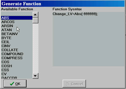 The Data Step Wizard provides graphical user interface for generating data step functions. In this instance the Exp() functions has been preliminarily selected.