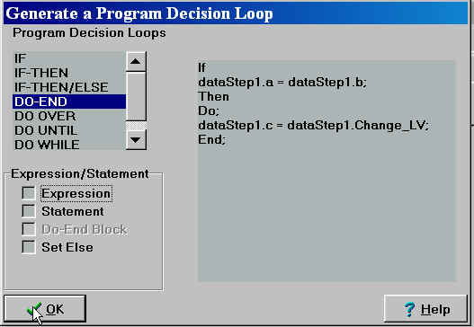 The Data Step Wizard provides graphical user interface for generating program flow control. In the instance shown above a ItThenElse program element has been selected. The "expression" part of the syntax has been defined and awaits the "Then" block statements.