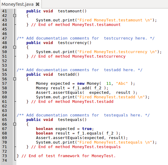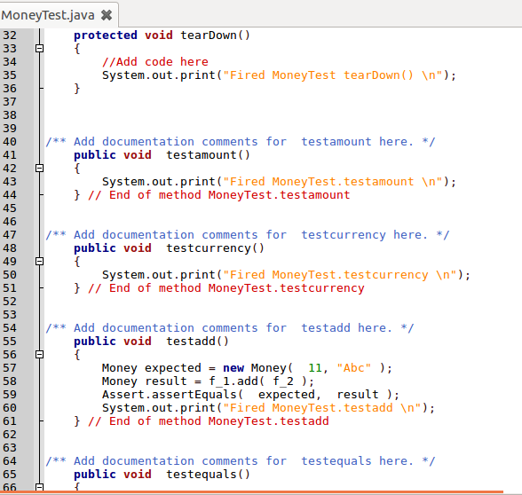 This panel shows the content added for test setup, test teardown, individual function tests, and testing assertions