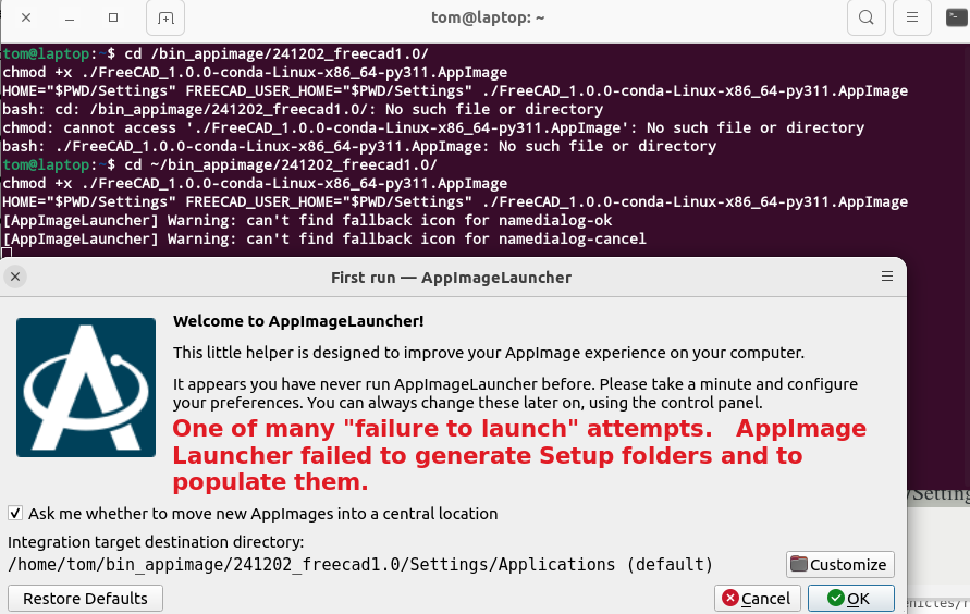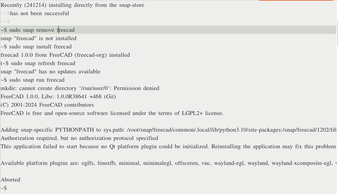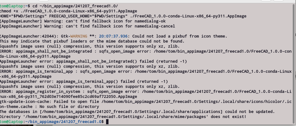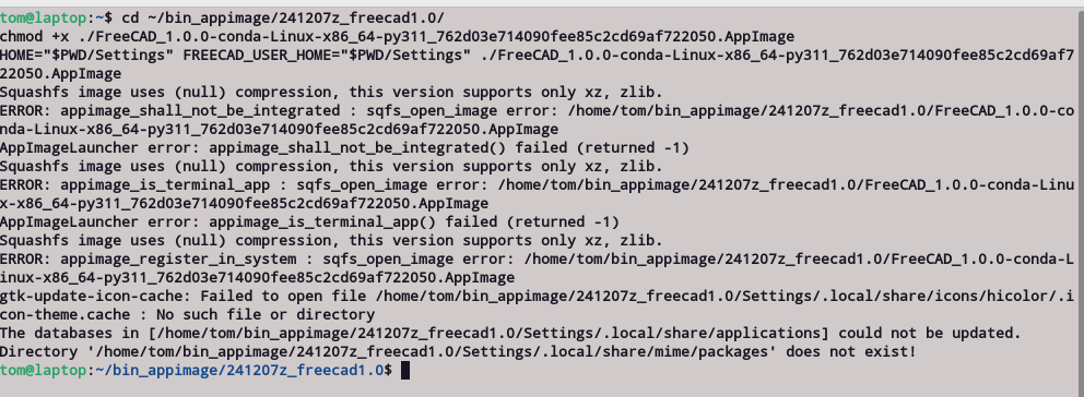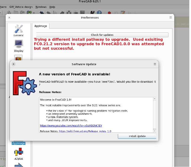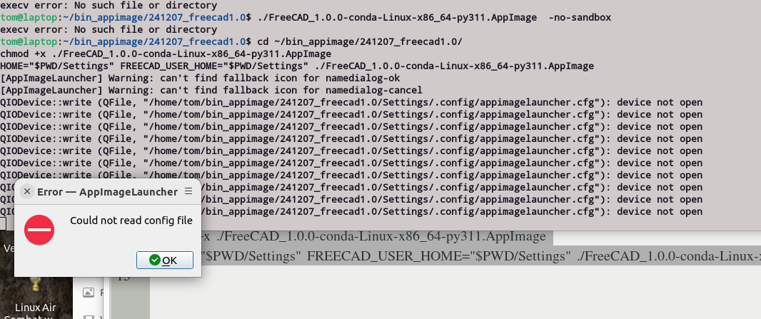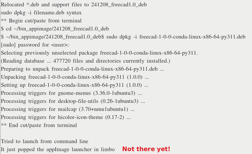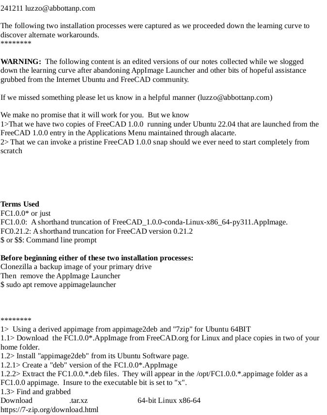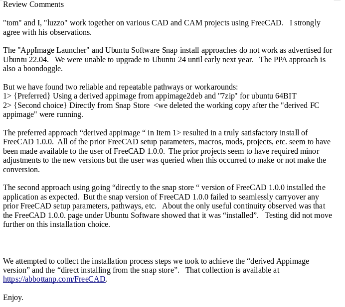 Ubuntu Software FreeCAD 1.0.0 Our Review ![]() Two Workarounds ![]() Current FC1.0.0 ![]() ********************** Problems Installing Deadstick from Ubuntu Sofware Application FreeCAD 1.0.0 Snap ![]() ![]() 7 ![]() 8 ![]() Suggestion: AppImage --no-sandbox ![]() Tracking Footprints of Possible Solution ![]() Tracks ??? ![]() SWAG: Upgrade from Current FreeCAD 0.21.2 ![]() TBD ![]() |