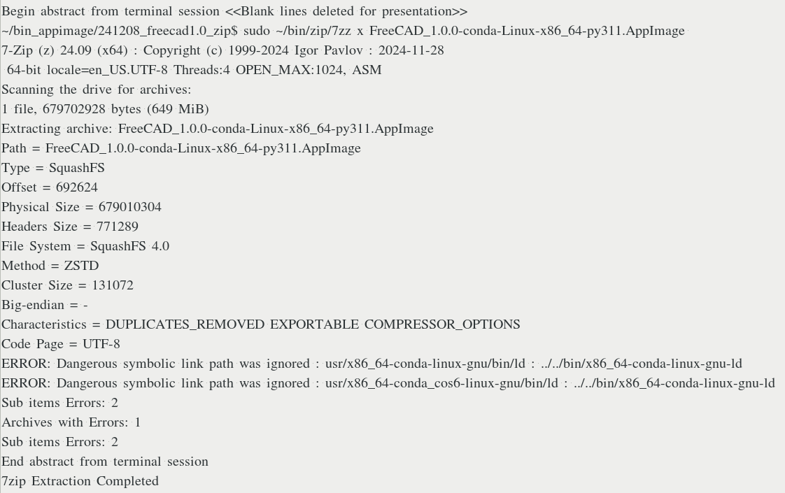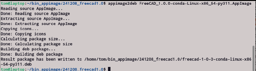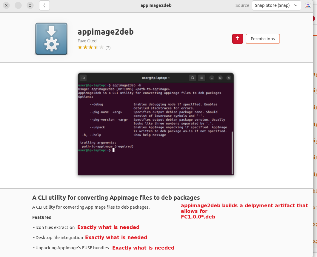 deb + zip Extract appimage Artifacts Install aapimage2deb ![]() Convert FC1.0.0*.appimage to FC1.0.0*.deb ![]() Extract FC1.0.0* from deb package ![]() Troubleshooting: Post dpkg Install FC1.0.0* Invoke alacarte. Create a new Item Browse to /opt/FC1.0.0* ![]() Need to locate a valid FC1.0.0* icon 7zip to rescue ![]() 7zip Extracting ![]() Folder Contents: Original AppImage Plus New Artifacts ![]() Artifact Detail ![]() Launch Access ![]() Sweet Success ![]() ![]() TBD ![]() |