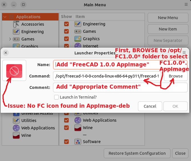 Older Workbenches Kills Preference and FC Session ![]() 52 ![]() 53 ![]() 54 ![]() 55 ![]() Different Fonts?? Same AppImage ![]() Launch Sites Require Manual Setup Main Menu Launchable ...Engineering ![]() ...Graphic ![]() ...Science ![]() Desktop Launchable But Icon Linakge Issue ![]() Resolved ![]() Select Icon ![]() |