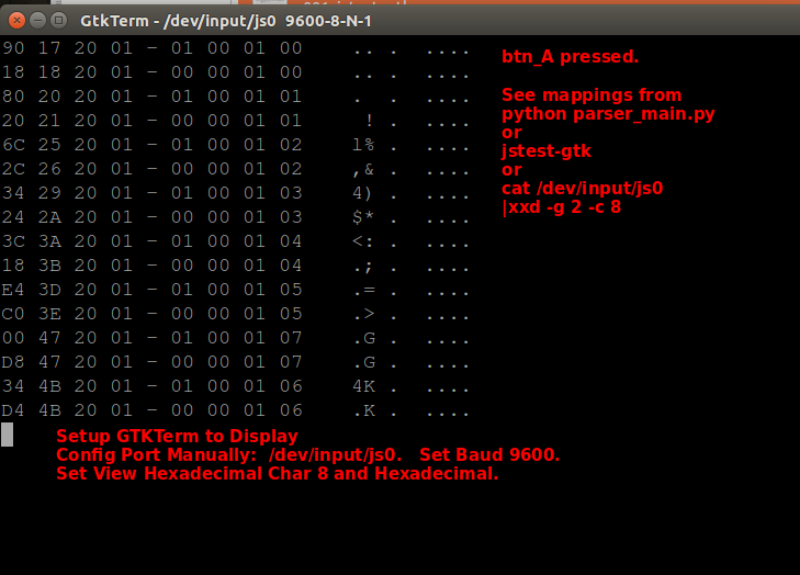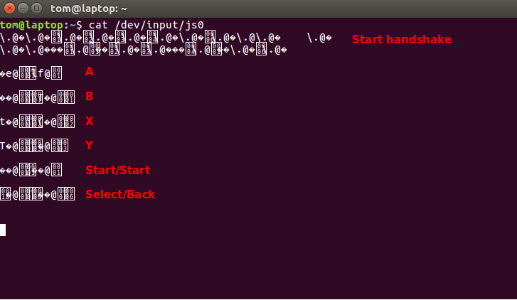 | cat /dev/input/js0 | Displays Raw gamepad traffic for js0 |