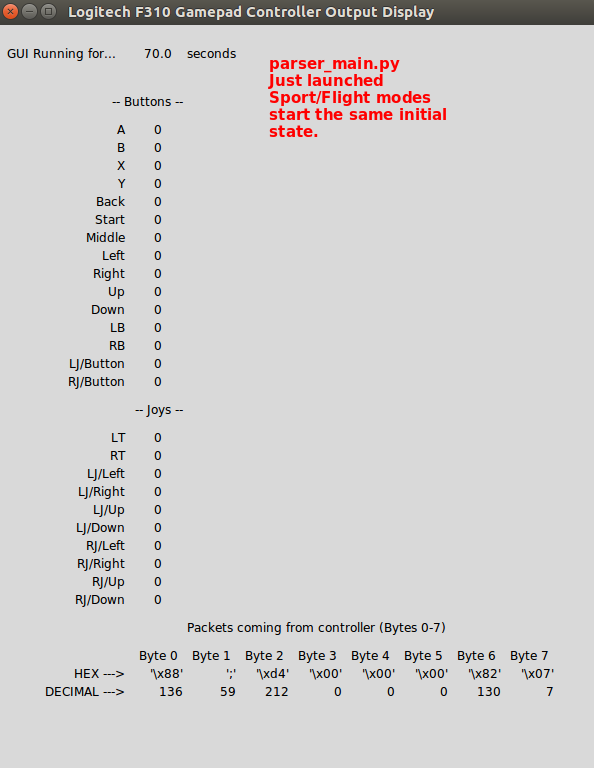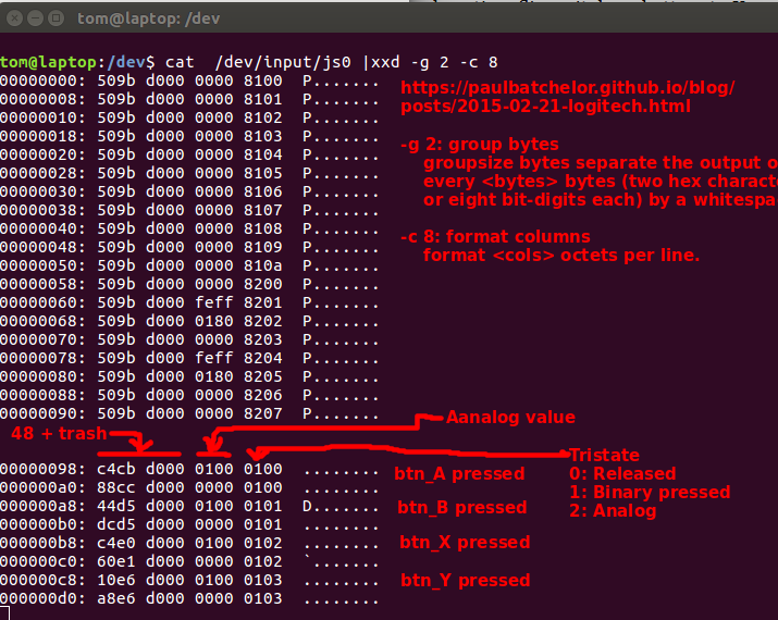 | cat /dev/input/js0 |xxd -g 2 -c 8 | Displays the characters reflecting F310 play/press |