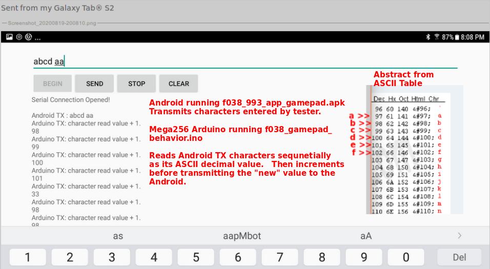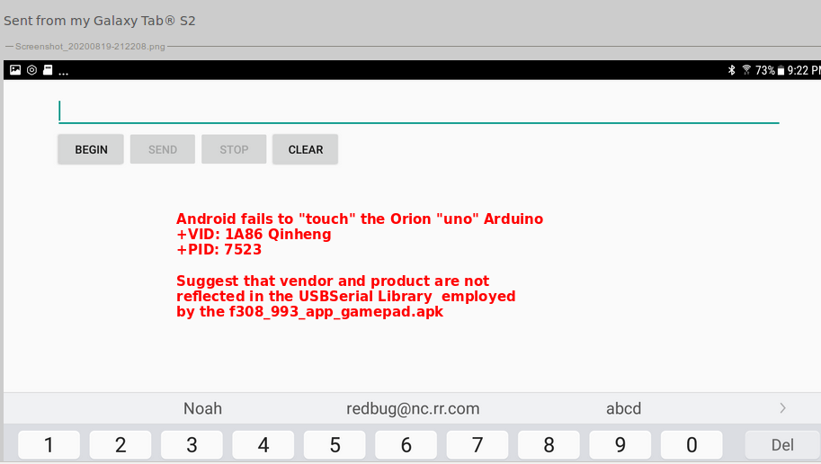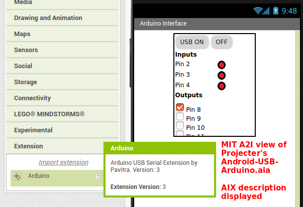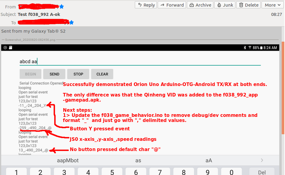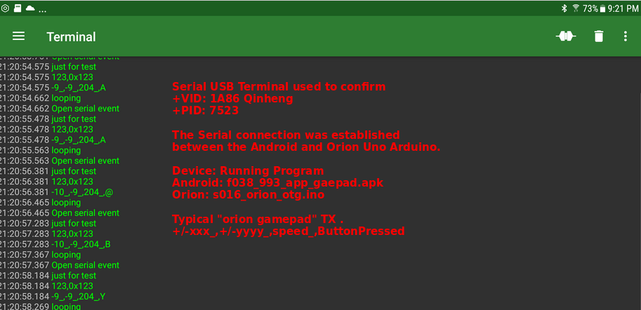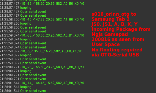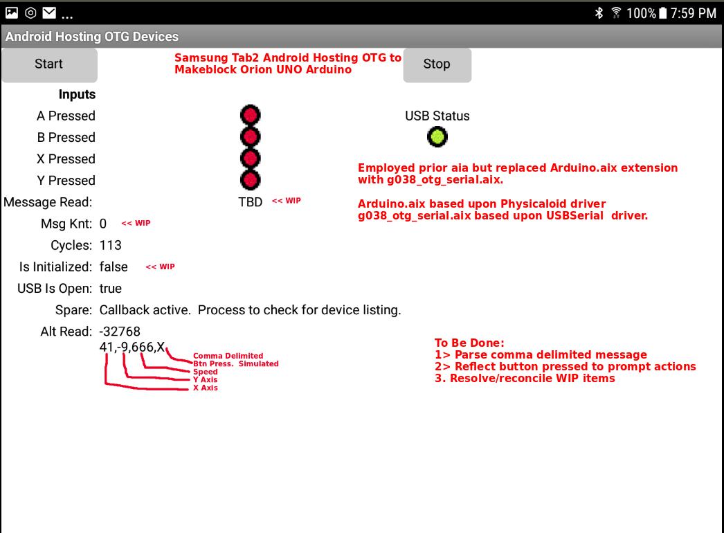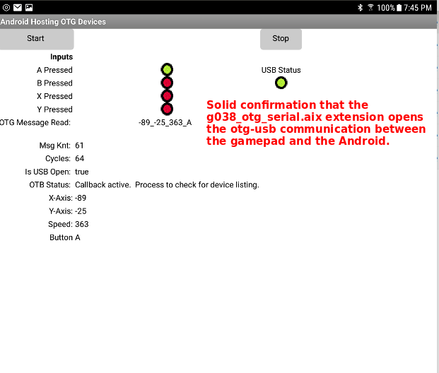 Fortunately, an example was found that demonstrated that data packages could be transmitted over the OTG to the Android. The example employed the USBSerial driver. The example was re-used on the "proposed solution assembly of components" and satisfactorily demonstrated "gamepad UI" potential. However, the example and the "re-used" versions were built using the Android SDK Studio. The "example-USBSerial" approach was de-engineered and re-generated using the mit-cml/extension-template authored by ewpatton.
