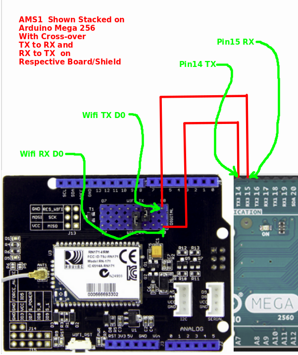 A cross-over between the Mega256 Pin15-RX to Wifi TX D0