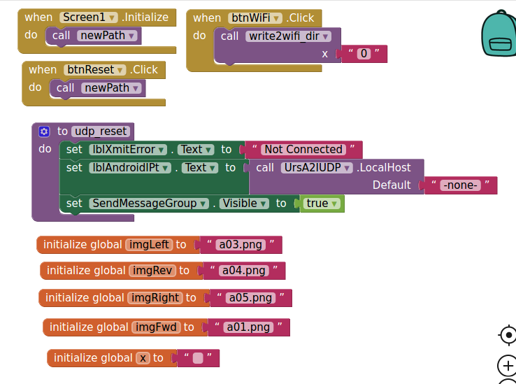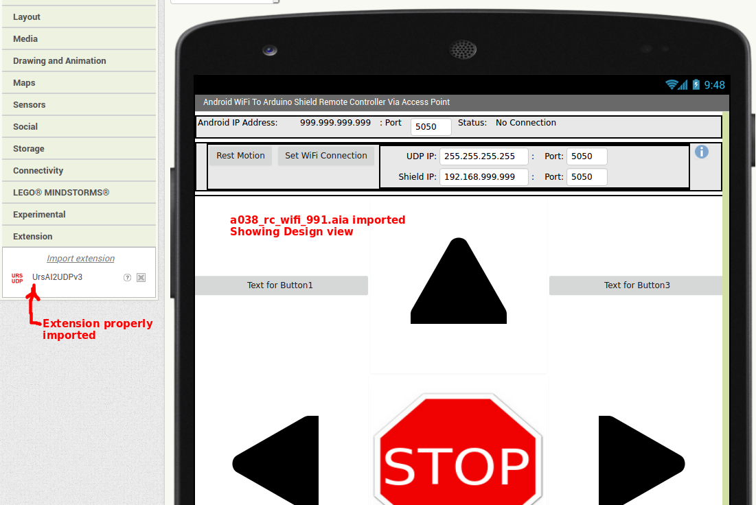 Using the on-line A2I the sketch block program a038_rc_wifi_991.aia and the extension UrsAI2UDPv3.aix it should be possiblibe