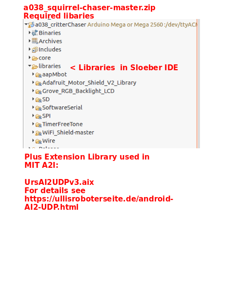 | The source files are commonly called header files and sketch files. The source files associated with the Abbottanp squirrel-chaser vehicle Platform project can be downloaded from the GITHUB: https://github.com/trooker/a038_squirrel-chaser. The source files will arrive as a zip package a038_squirrel-chaser-master.zip. Once the content of this bundle has been extracted they can be directly file copied into the project folder. Then the project needs to be refreshed or restarted depending upon the IDE selected to have sources file reflected in the project. |